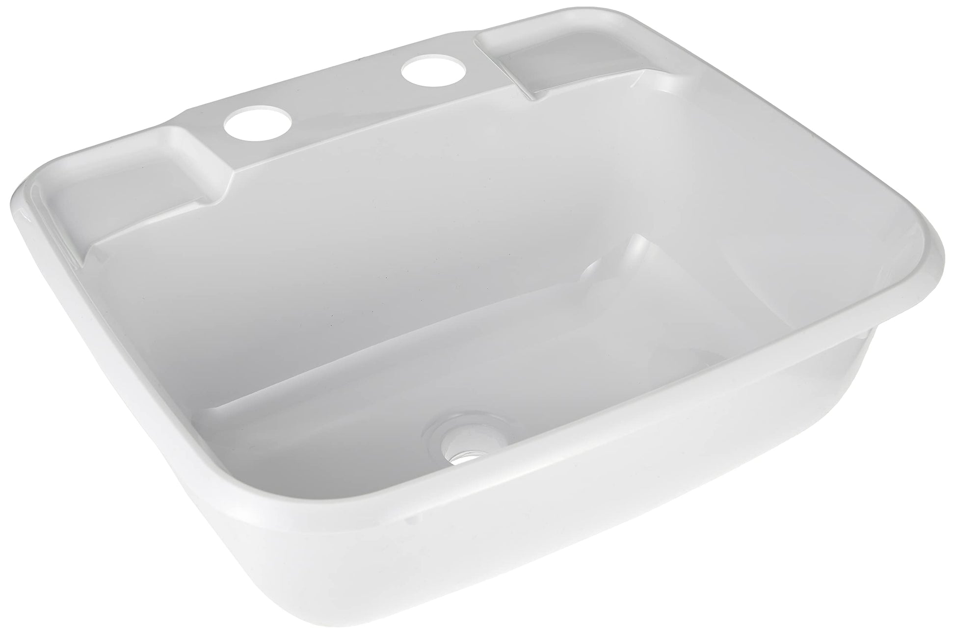 Details: The JR Products Molded Lavatory Sink incudes a 6" long tail flange with ABS glue, a 4" rubber sink stopper, mounting clips and screws. Overall Dimensions: 6" Tall x 14-7/8" Wide x 12-3/8" Deep. Cutout: 14-1/4" Wide x 11-1/2" Deep.
