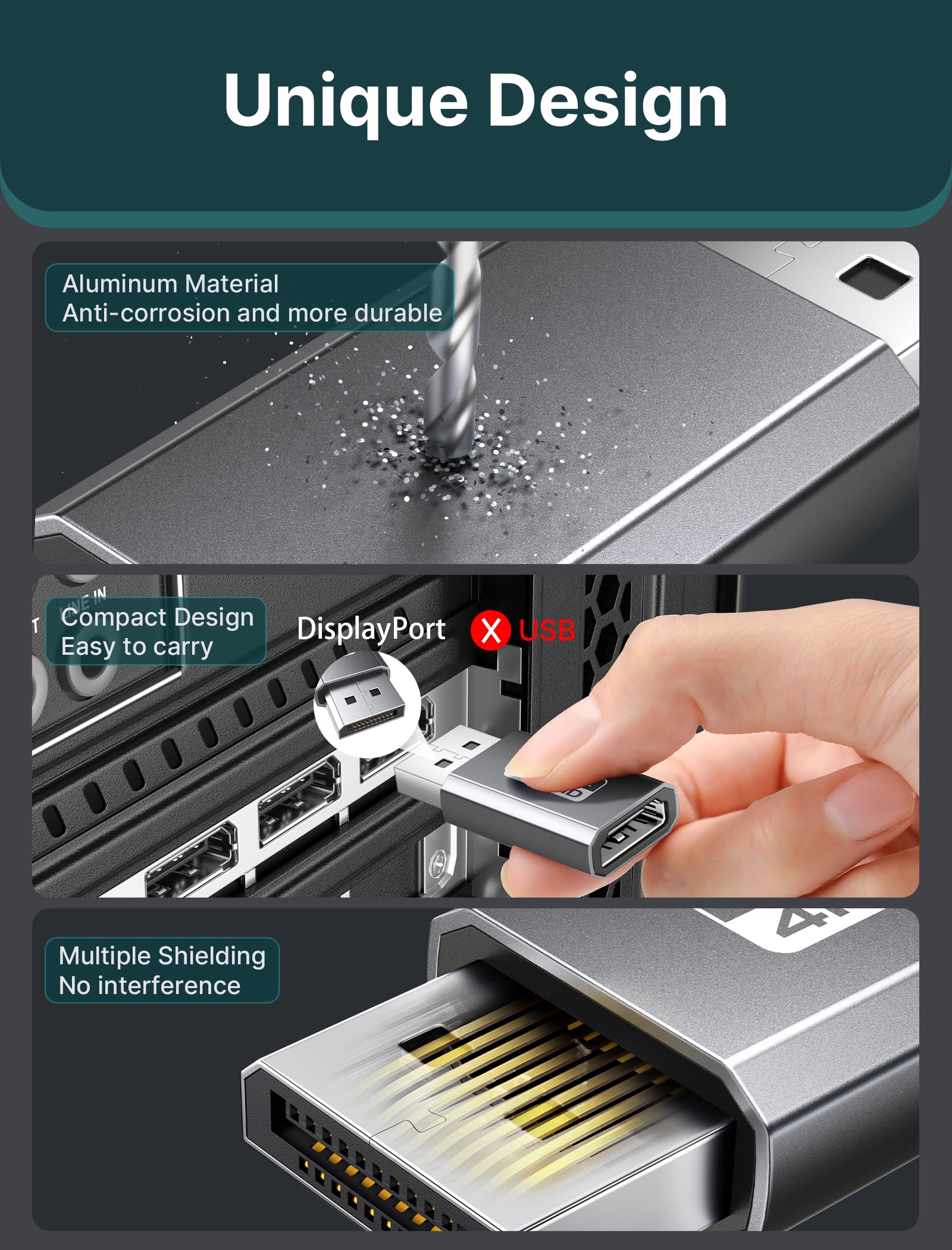 • 【Important Compatibility Notice】: This is a DisplayPort (DP) to HDMI adapter and only works from DP-enabled devices (such as desktop GPUs or docking stations) to HDMI displays. It does not support HDMI to DP conversion or USB-C/Thunderbolt ports. Using it incorrectly may result in no signal, overheating, or device malfunction. Please confirm your device has a DisplayPort output before purchasing