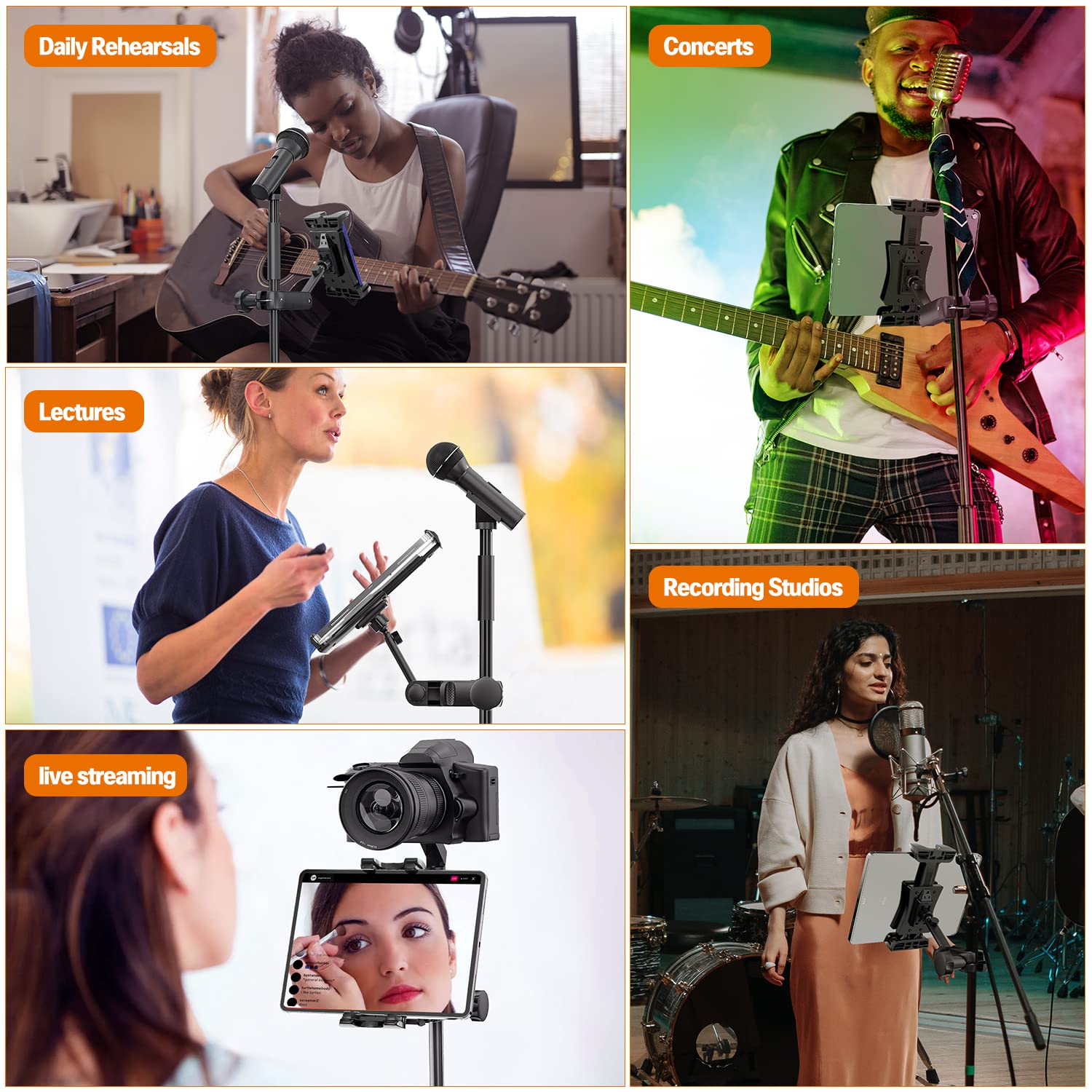 • Wide Compatibility - The tablet holder for the mic stand is compatible with all 4.7 to 12.9-inch screen tablets (horizontal placement)and Fit All Smartphones; such as iPad Pro, iPad Air, Surface Pro, iPad mini, Galaxy Tab, etc and iPhone 13, 13 mini, 13 pro, 13 pro max, Galaxy S9 S8 S7 Edge, etc.
