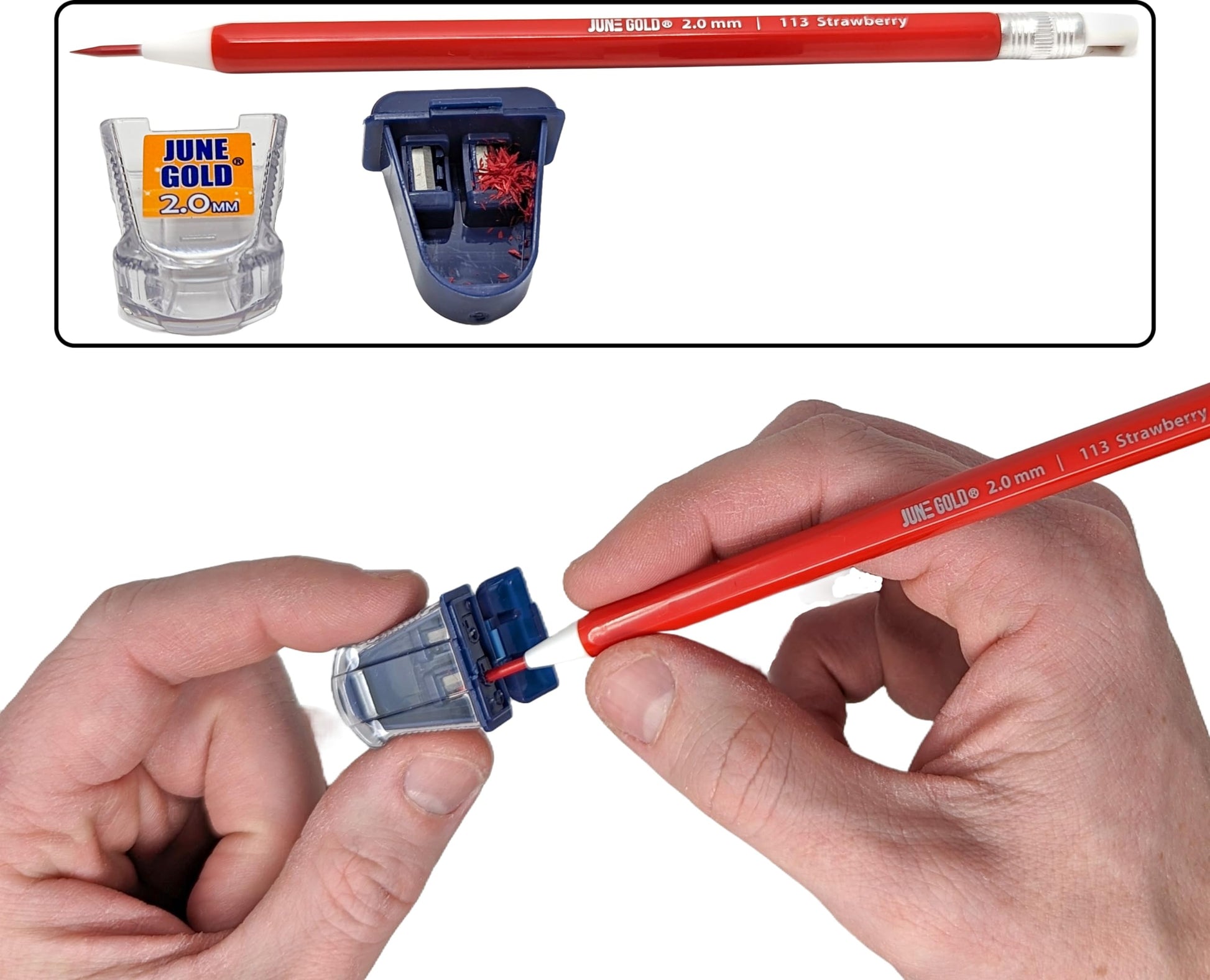 • SHARPENERS: 2 independent sharpeners with a total of 4 sharpening blades are included. Each clear sharpener container holds shavings until you are ready to discard them. Sharpening is as simple as flipping open the cap from the blade side, inserting the lead into either hole, and gently rotating the lead clockwise. Extend your lead at least 0.25 inches or 6.5 mm out of the pencil to fully sharpen to a point. Separately, each pencil sports a sharpener on the rear clicker.