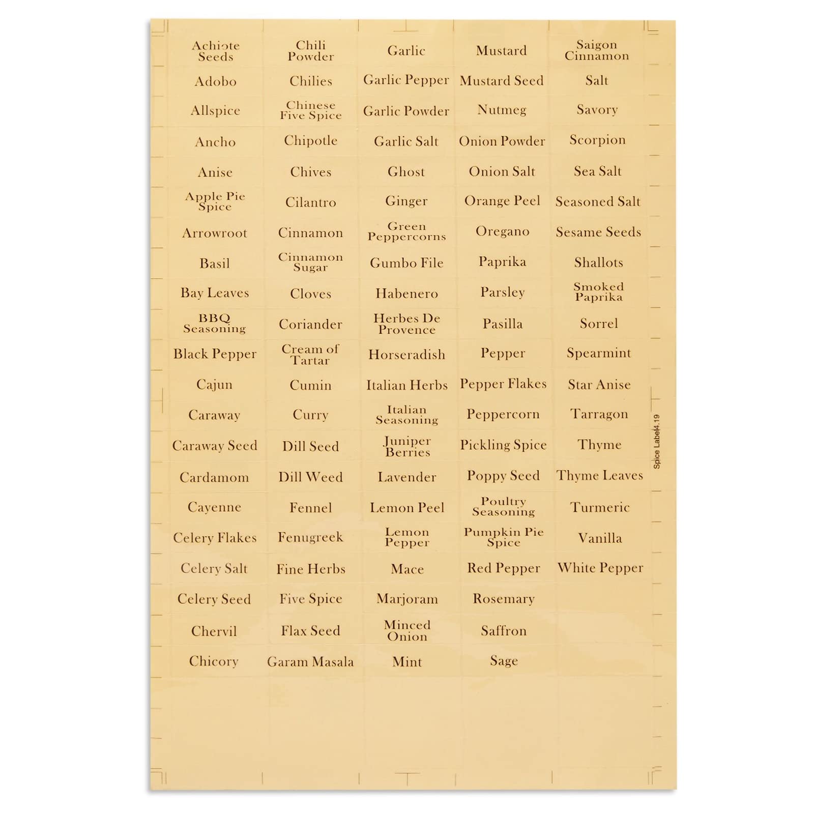 • Preprinted Spice Labels: These spice containers with labels include 96 preprinted options for essential flavorings such as cinnamon, black pepper, basil, cilantro, ginger, parsley, and cumin