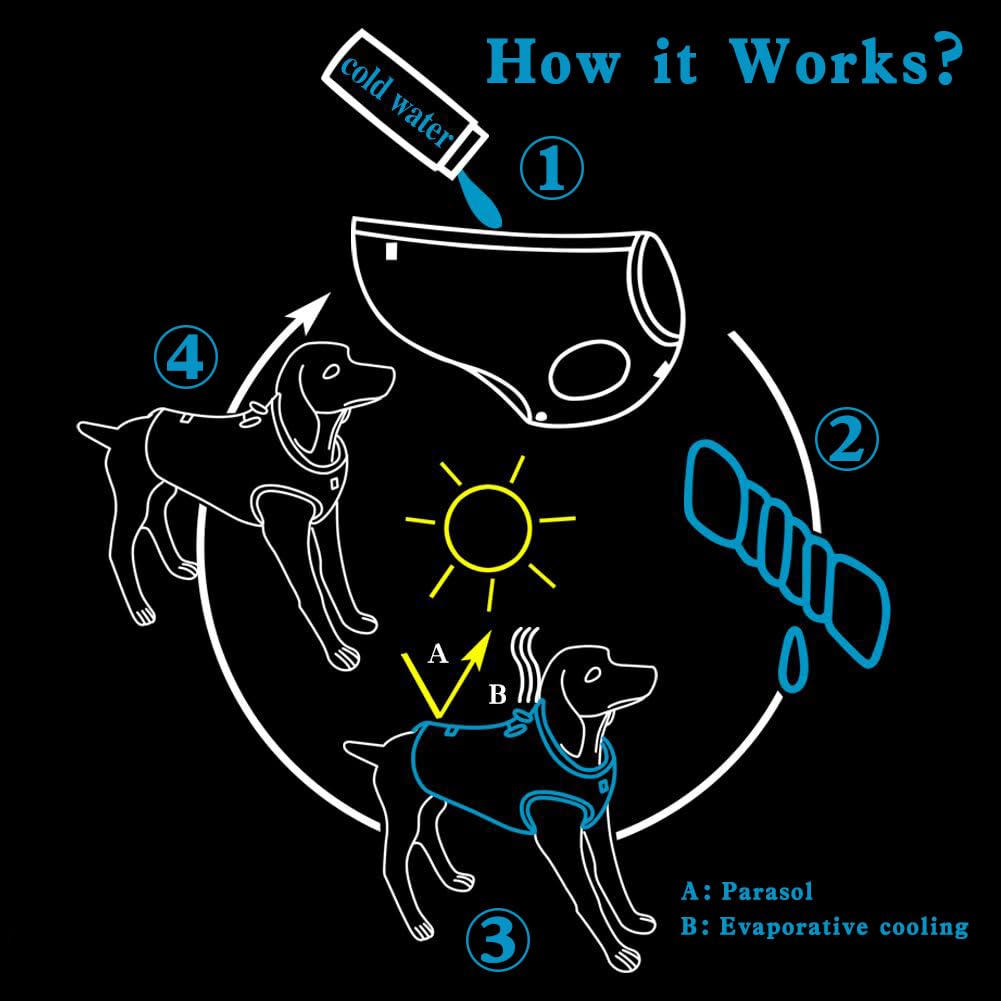 • COOLING THEORY:Soak it in cold water, WRING IT OUT(Must wring it a bit dry), and put it on your puppy. The evaporative cooling theory replaces the dog's heat as water evaporates from the coat's reservoir and temperature drops by the wicking outer layer , absorbent middle and comfortable inner layer .
