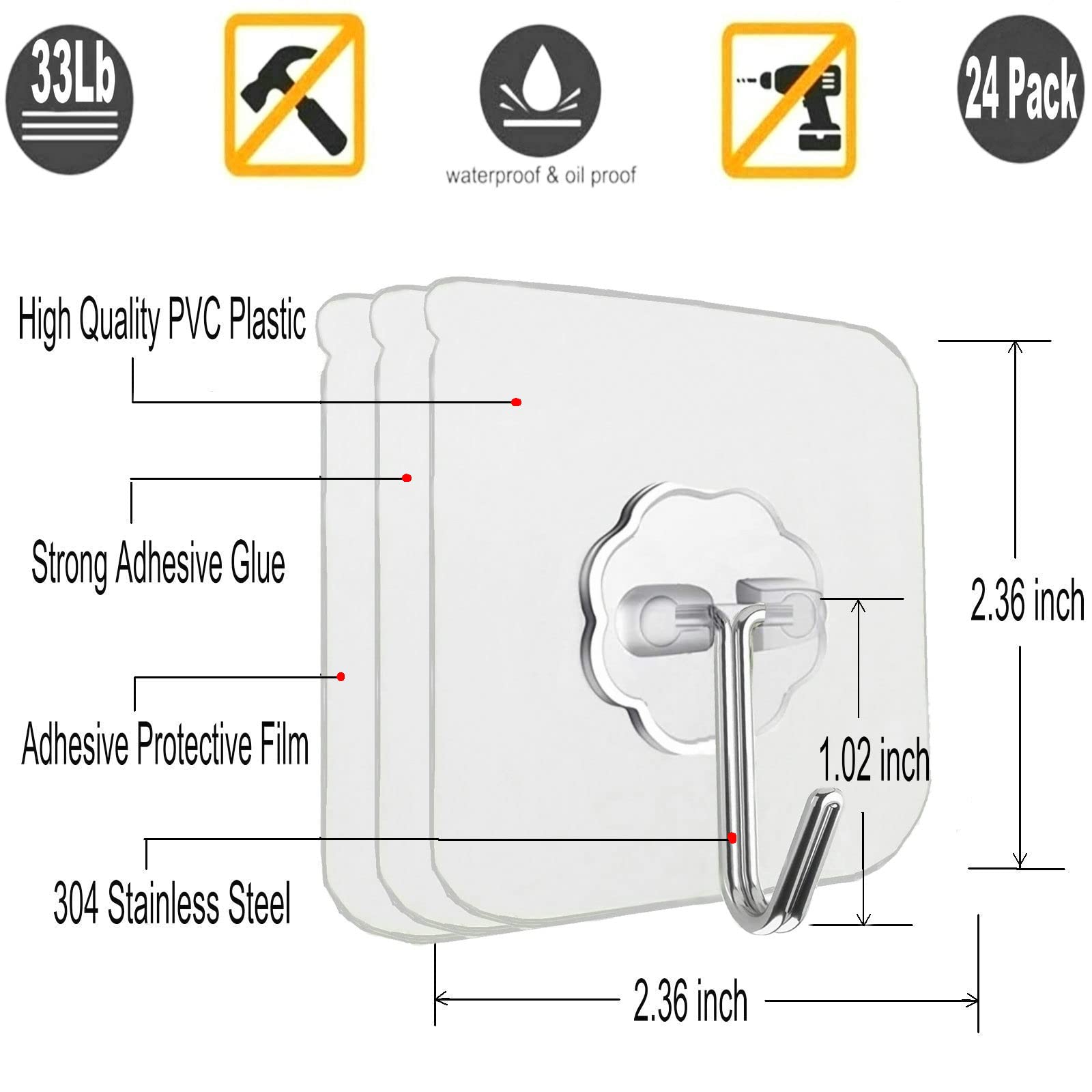 Jwxstore 24 Pack Heavy Duty Self Adhesive Hooks - 33lb Max, Transparent, Waterproof, Sticky Wall Hooks for Keys, Bathroom, Shower, Outdoor, Kitchen, Door, Home Improvement, Utility