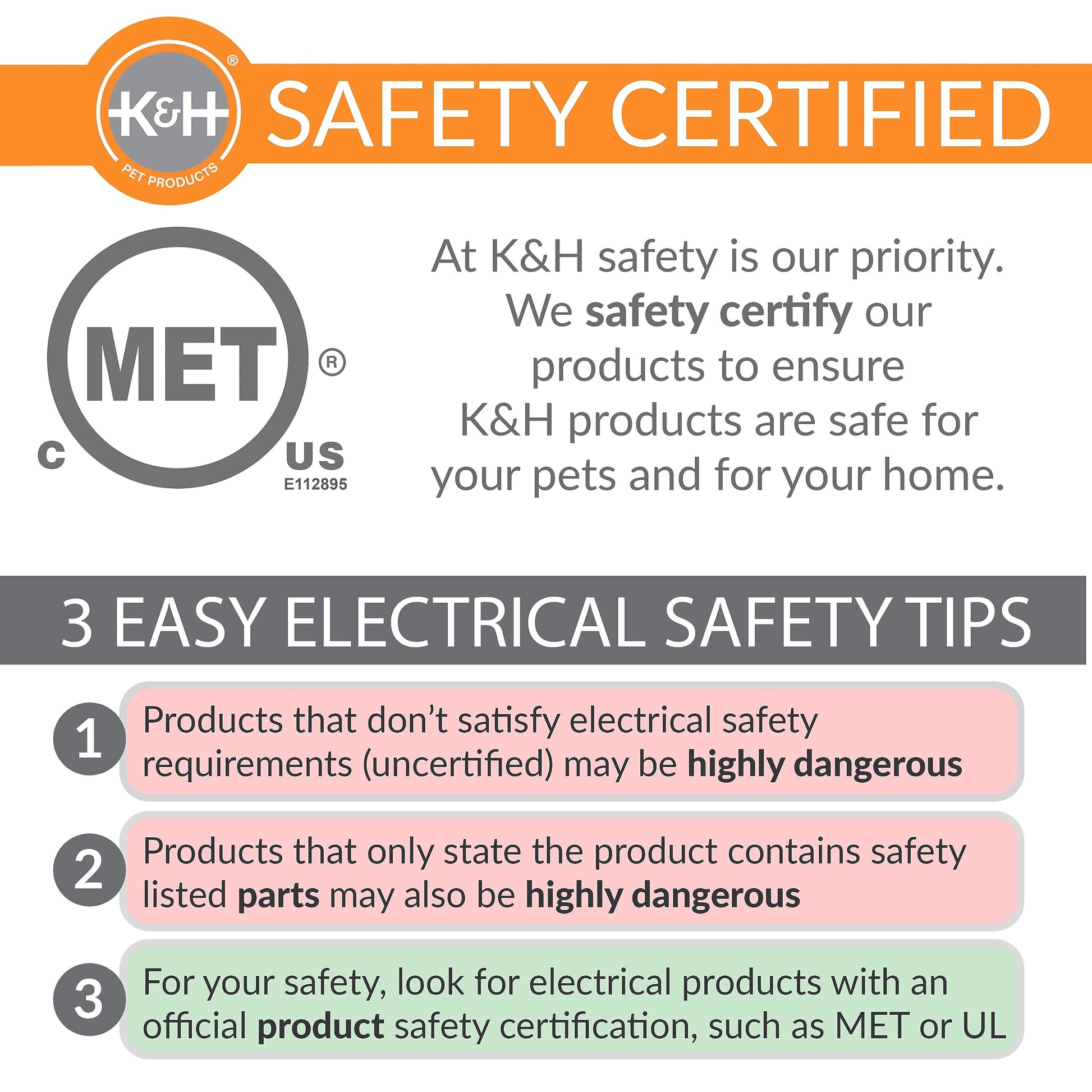 • SAFETY: K&H heated pet beds are tested & certified by MET Labs and exceeds USA/CA electrical safety standards; K&H doesn't just use safety listed parts, we safety certify the entire product - For indoor household use with 110/120 volt electrical current only