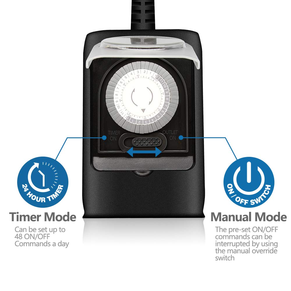 K KASONIC - Outdoor Light Timer Outlet, 24 Hour Mechanical Switch, Heavy Duty Plug in Timer Waterproof with 2 Grounded Outlet, ETL Listed (Black)