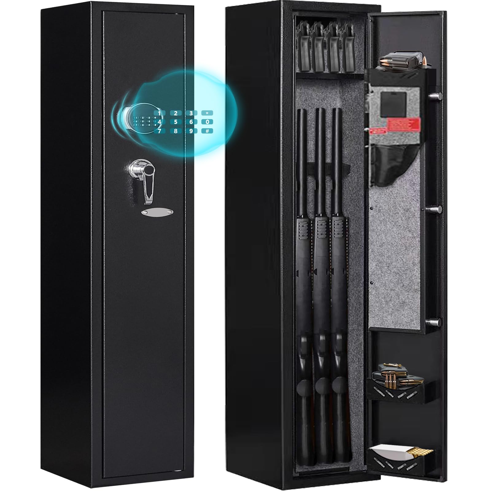 • 【Multiple Functions】 The Rifle safe has removable shelves inside so you can fit the shelves to the length of your rifle gun and your own needs. On top of the gun safe is a pistol rack for 4 pistols, the pistol rack will help you store more guns and save more storage space! The Rifles safe comes with 3 ammunition bins on the door for storing ammunition, firearm accessories and more!