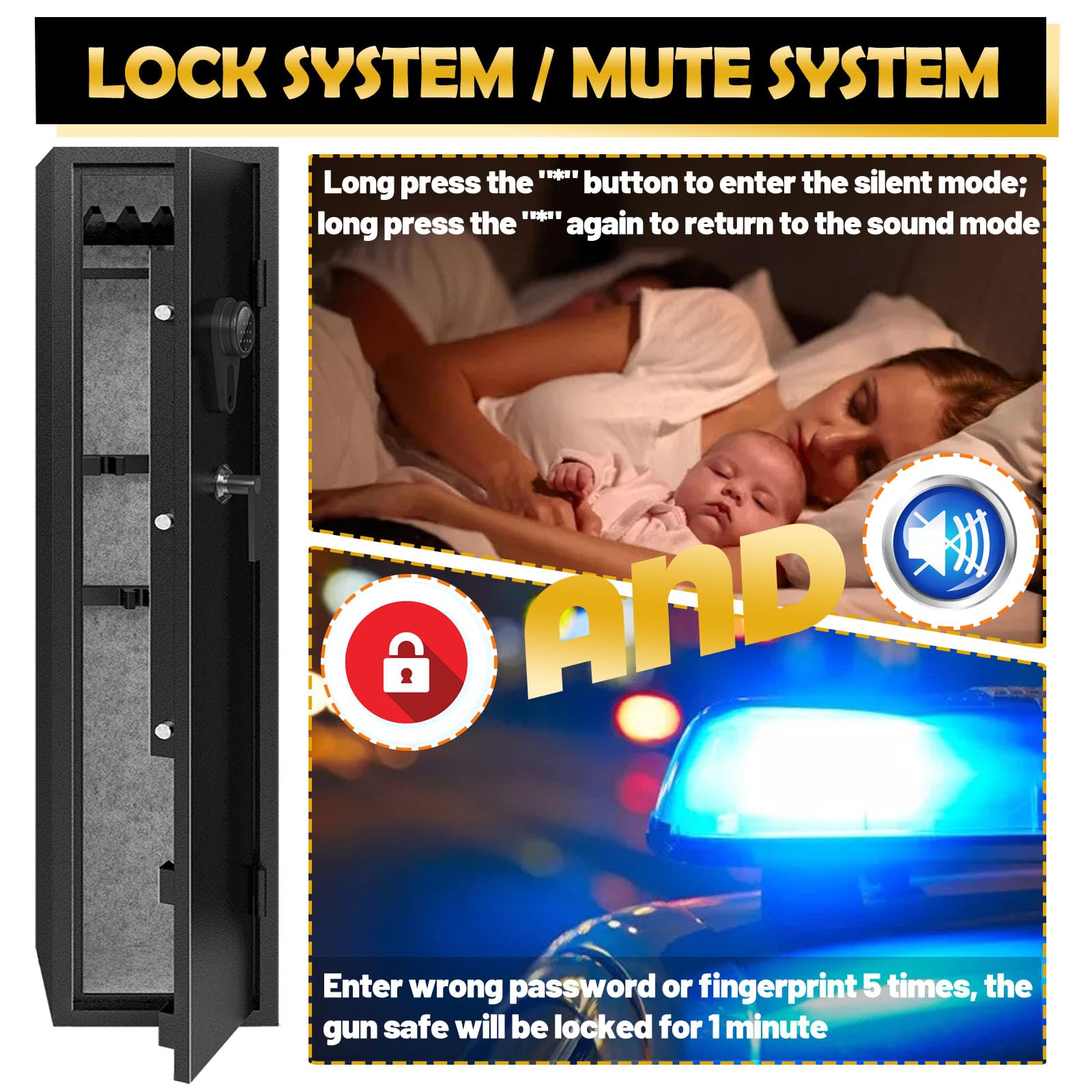 • 【Three Modes of Entry Gun Rifle Safe】Three ways to open the door! Our gun cabinet is equipped with one-touch biometric system and 9-digit PIN number, we also provides 2 emergency keys and emergency power for quick access. Make sure to keep the emergency keys and power out of your safe in case the battery die.