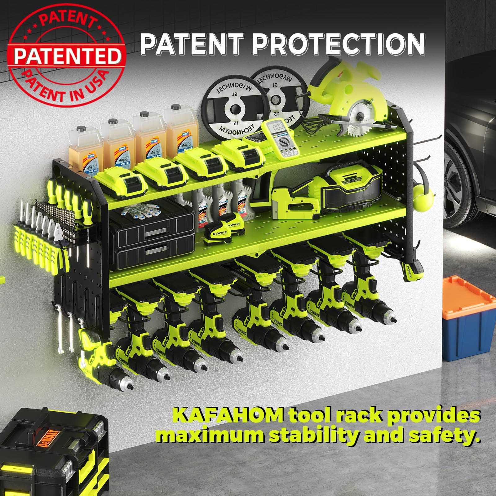 • STRUCTURAL OPTIMIZATION: The KAFAHOM top-of-the-line garage organization rack features a revolutionary structure design that provides exceptional stability and increased weight capacity for your power tools. Thanks to the optimized structural design and aspect ratio - not only is it can perfect for the 16" wall studs, but the utility cordless drill holder can be mounted on concrete, drywall, pegboard. Plus, the lower part can hold up to 8 heavy power tools.