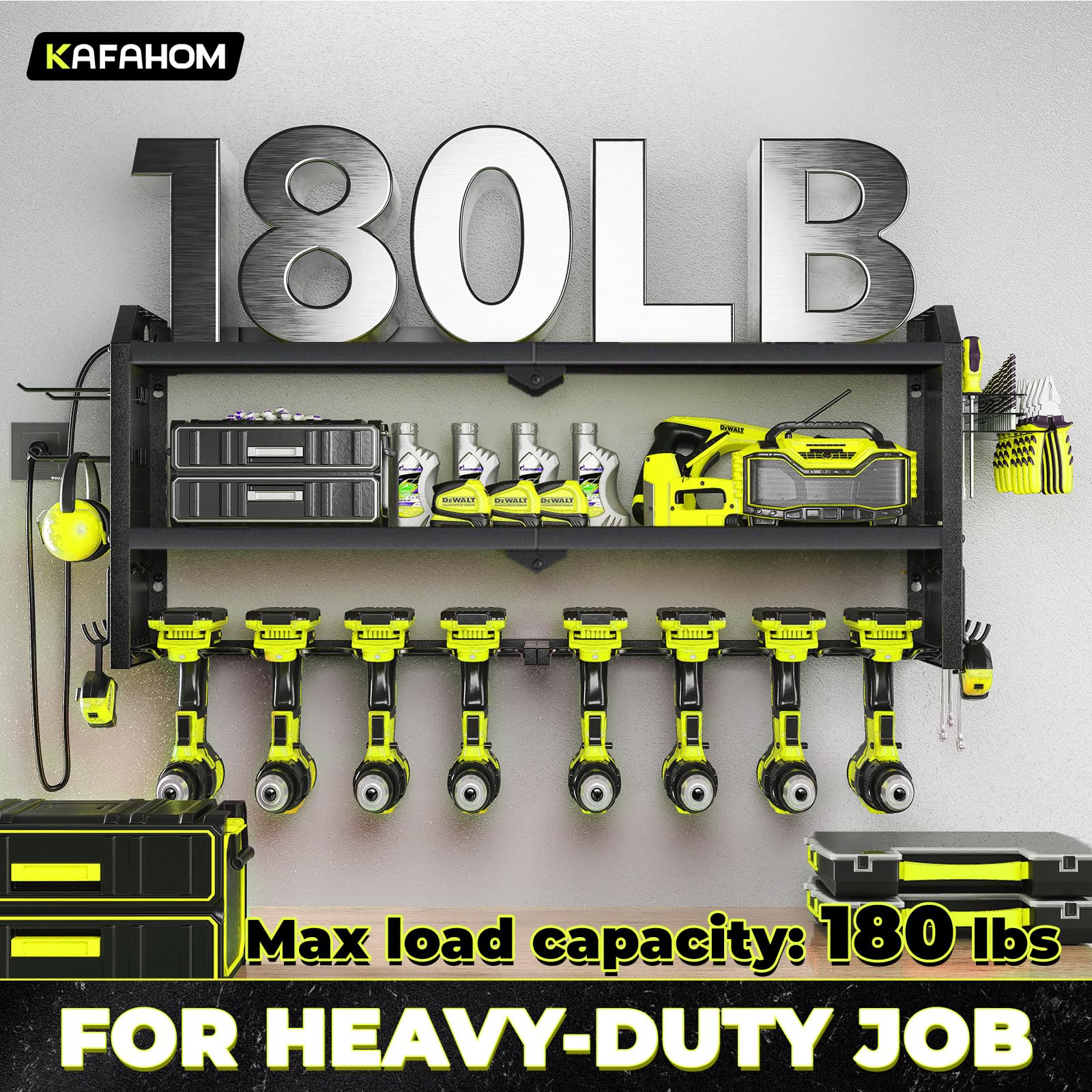 • Robust Construction: Built to last, KAFAHOM tool box organizers and storage wall mount features a sturdy alloy frame and reinforced double-layered metal plates for exceptional load-bearing capacity. It's the ideal utility cordless drill holder for a wide range of tools and accessories.
