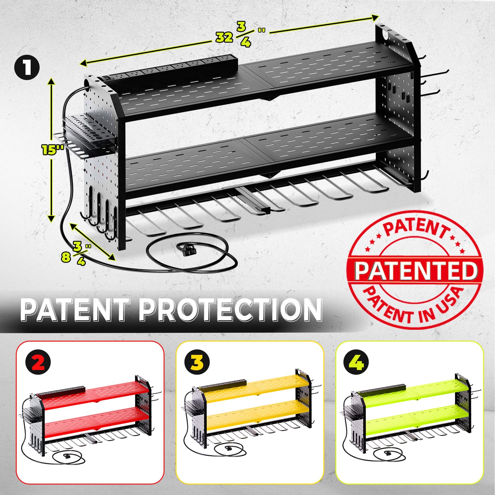 • Efficient Storage: The KAFAHOM Electric Tool Rack is designed with three tiers and eight dedicated slots to efficiently store your electric tools. The top tier features a built-in charging station, enabling direct charging while tools are stored.The power cord is 7 FT long 14AWG,and the charging station is 15A 125VAC 1875W 60Hz.