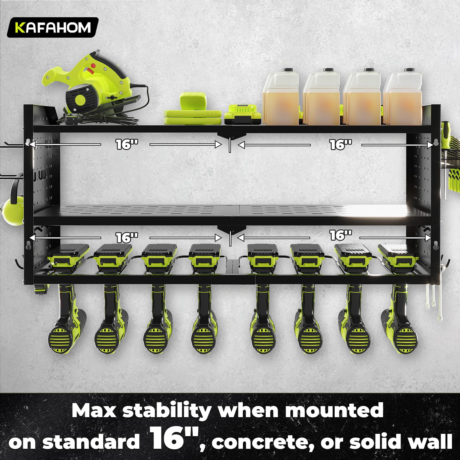 • Easy Installation: KAFAHOM garage wall shelving schieve maximum stability with a straightforward installation process. Whether you're mounting it on a wooden wall, concrete surface, or pegboard, this tool rack wall mount is designed for easy and secure attachment.Amazing christmas or father's day gift for men.