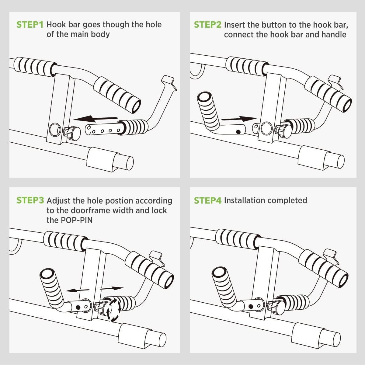 • Though great efforts are made to let it fits all doorways (the distance between two 'hooks ' shorted to fit some narrower doors. The upper bar also cut short to fit doors in the corner around walls). Ensure doorframe is in good condition and can withstand the weight and stress of using a pull-up bar (not suitable for hollow plasterboard walls).24-Month Hassle-Free Warranty, Easy to Reach Customer Service. So buy it at ease now!