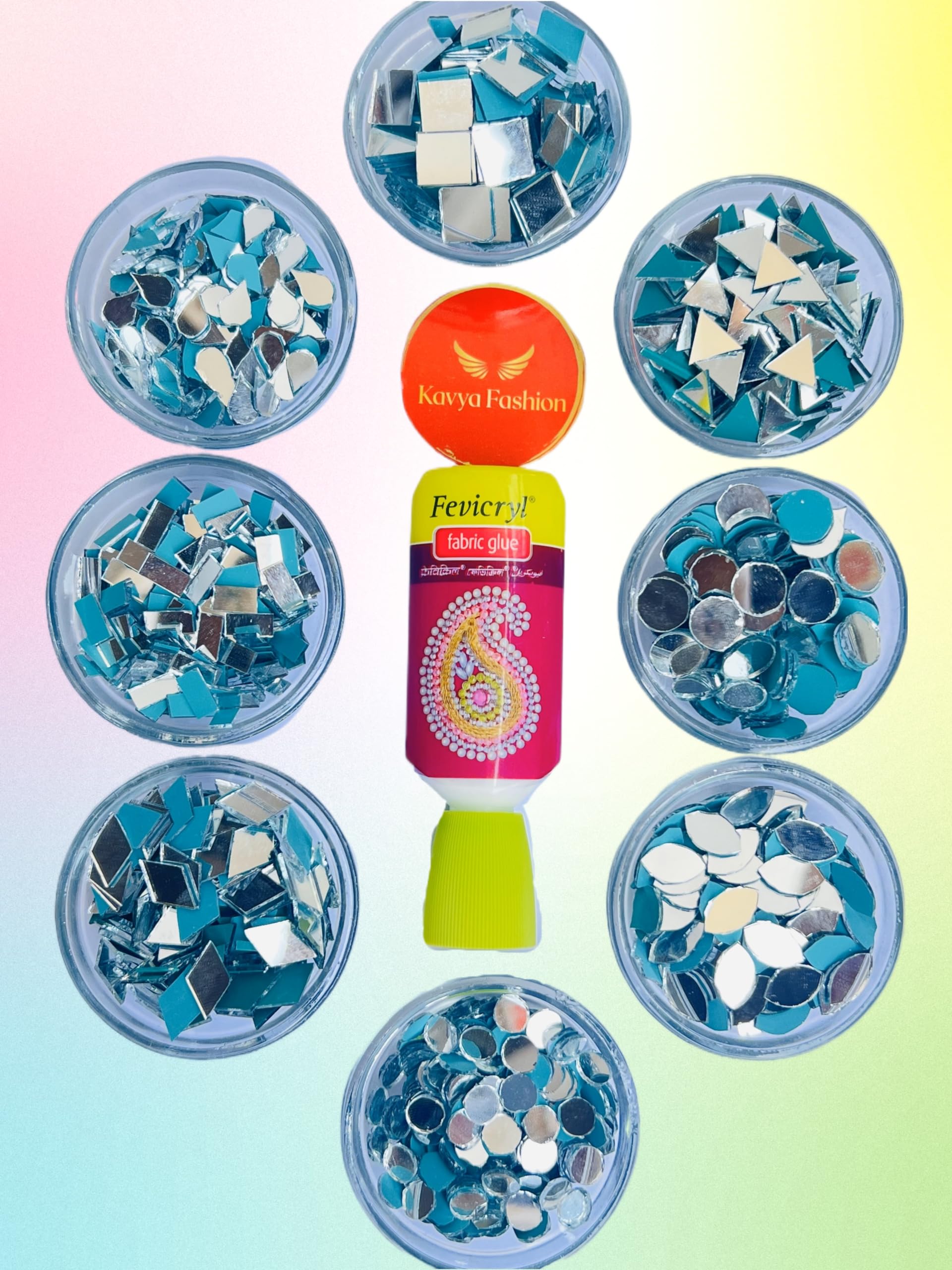 Kavya Fashion 8 Shape Mirror kit for Jewellery Making,Other Craft Work Like Project & lippan Art, mud Work Decoration (Total-800 Pieces, 100 Piece of Each Shape) Free Fabric Glue (Combo of 8)