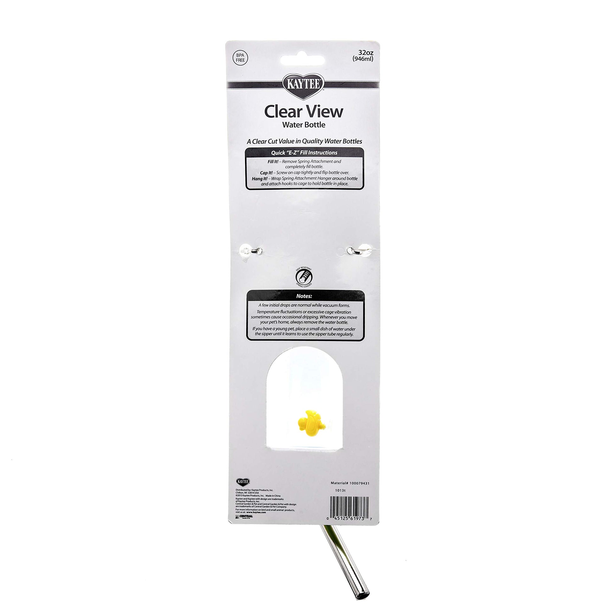 Details: The clear choice water bottle. Heavy duty spring attachment hanger secures bottle to any small animal wire home. Drip resistant sipper tube. Comes with a floating duck to remind owner to refill the bottle.