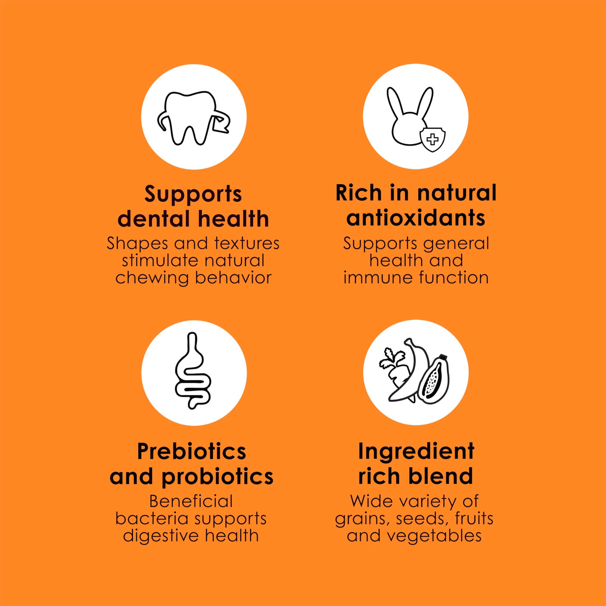 • SUPPORTS DENTAL HEALTH with a variety of shapes and textures, encouraging chewing activity