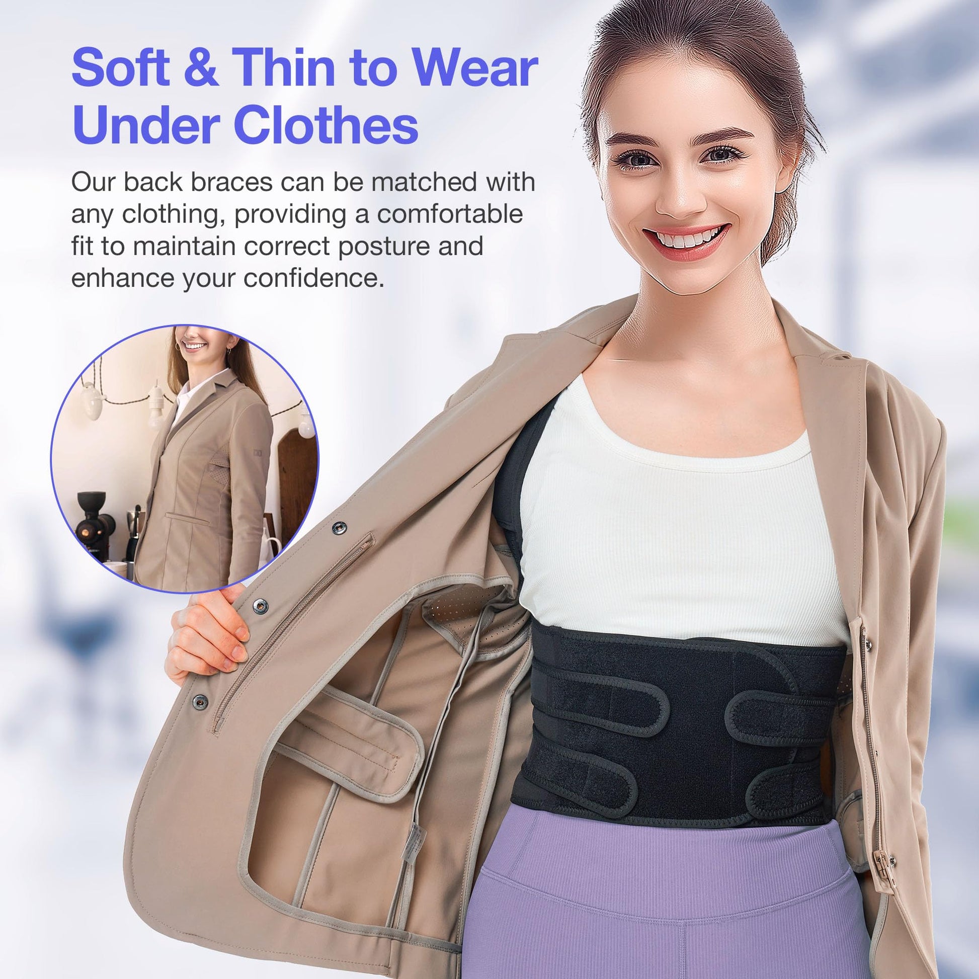 • Builds Confidence and Health: Regular use of a lower back brace helps correct conditions such as hunchback, trains your body to sit or stand in a healthy posture, and develops muscle memory to keep your back straight, helping to improve your overall spinal health and posture, making you look taller and slimmer. Back posture correctors for men can also relieve posture-related pain and provide long-term health benefits for people of all ages and lifestyles