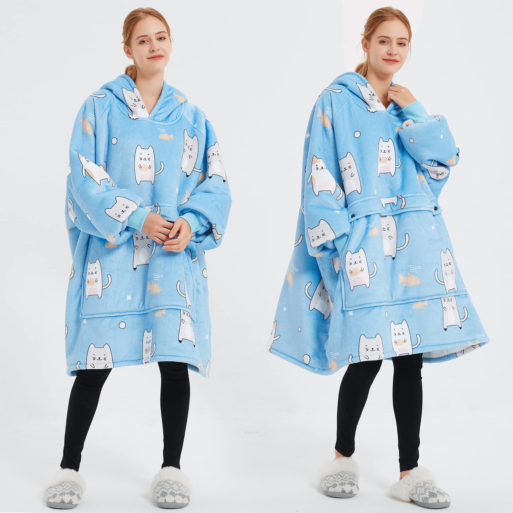 KFUBUO Wearable Blanket Hoodie for Adults Sherpa All Patterns Blue Cat Oversized Sweatshirt Blanket with Pockets Cute Gifts for Women