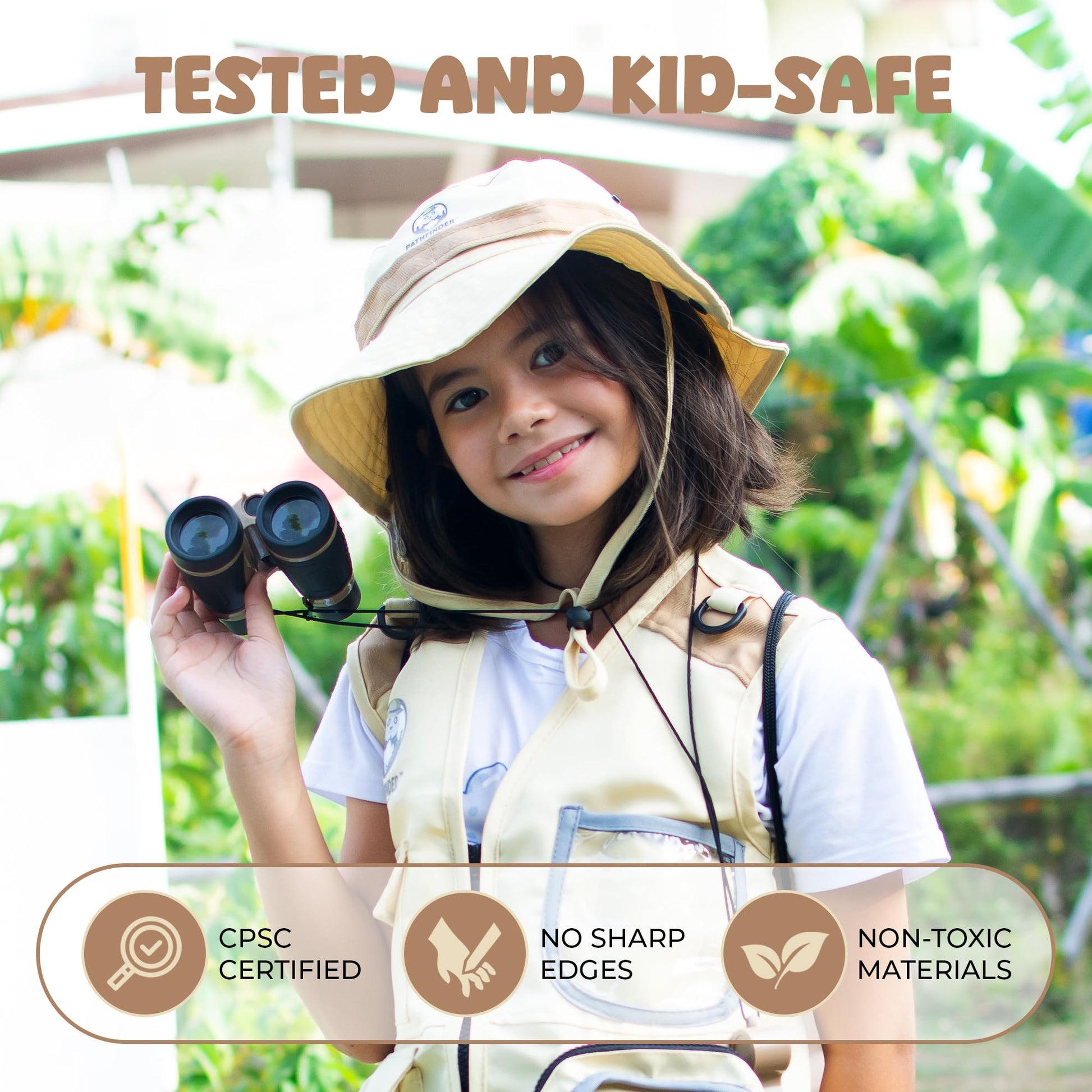 • COMPLETE KIDS EXPLORER KIT - This all-in-one outdoor adventure kit for kids includes binoculars, a butterfly net, a bug container, a flashlight, a safari vest & hat, and much more! Perfect for young explorers to catch, observe, and learn about bugs in nature!