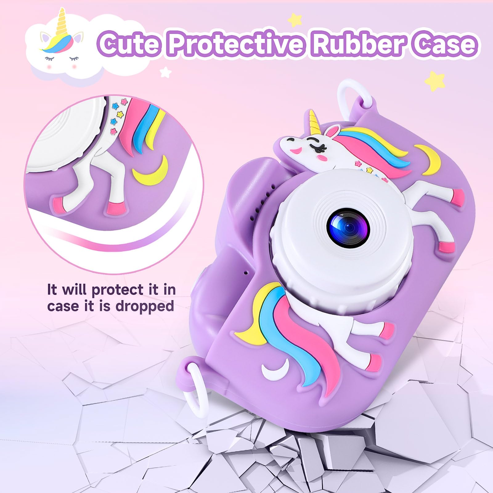 • FUN STICKERS AND FRAMES: Kids will enjoy fun stickers and frames when taking pictures, it certainly sparked kids interest in taking more artistic shots. The kids camera comes with a shockproof case with a cute design - this both against drops, and gives it more kiddie appeal