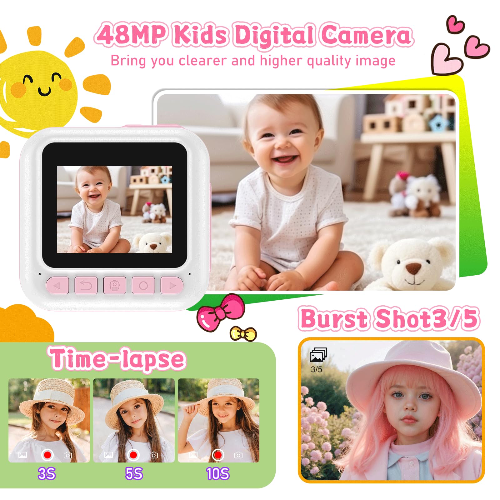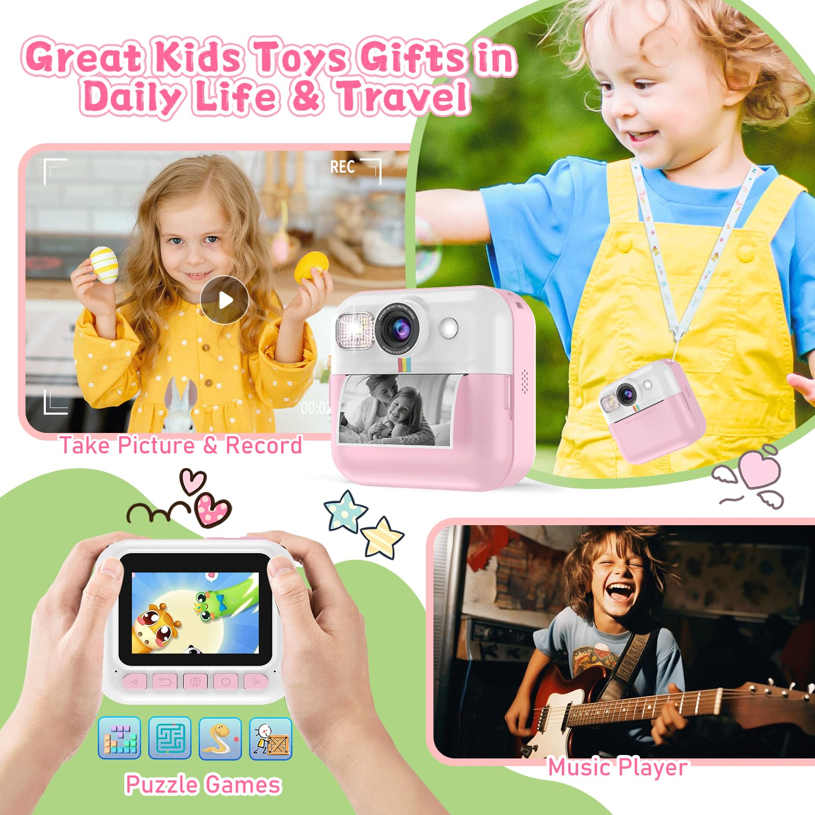 • Multifunctional Kids Camera Instant Print - All-in-one kids camera for photography, video, music, and games, portable and easy to use, specially designed for kids aged 3-12. Come with a 2.4 inch HD screen, 1080P video record, 4 puzzle games, supports MP3 music play, playback, multi-language, print photos, flash, date setting, etc. Kids Toy cameras meet your child's daily photography fun and record beautiful moments with family or friends