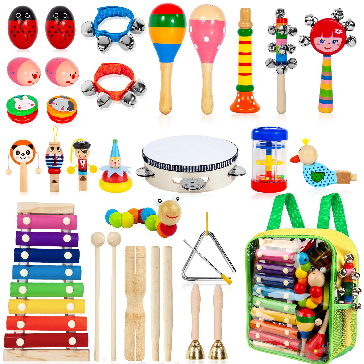 • [A Complete Kids Musical Instrument Set] - Including 33pcs 18 types shaking, tapping, beating and blowing instruments. Better way to start music than with a percussion set for preschoolers. Great and creative birthday gift for kids, boys, girls and toddlers.