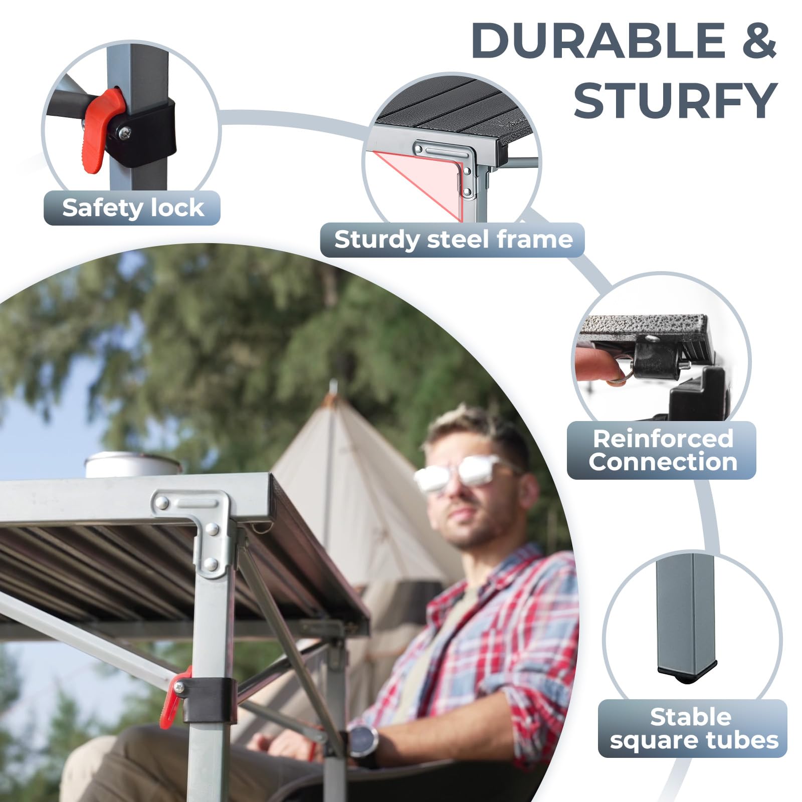 • 【Durable Aluminum Camping Table】This folding table camping is made of thicker aluminum alloy and anodized treatment, which is rust free, corrosion-resistant,easy to clean. The aluminum grill table adopts metal material contact point and triangular steel structure design to ensure stable use.