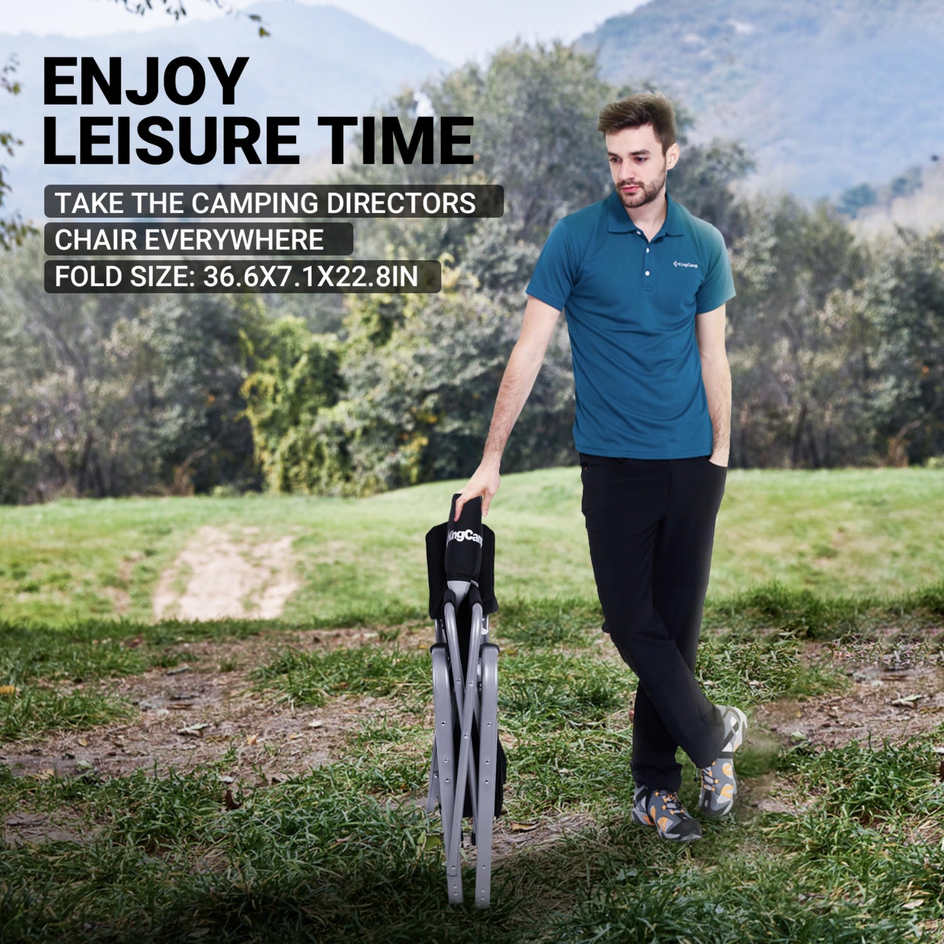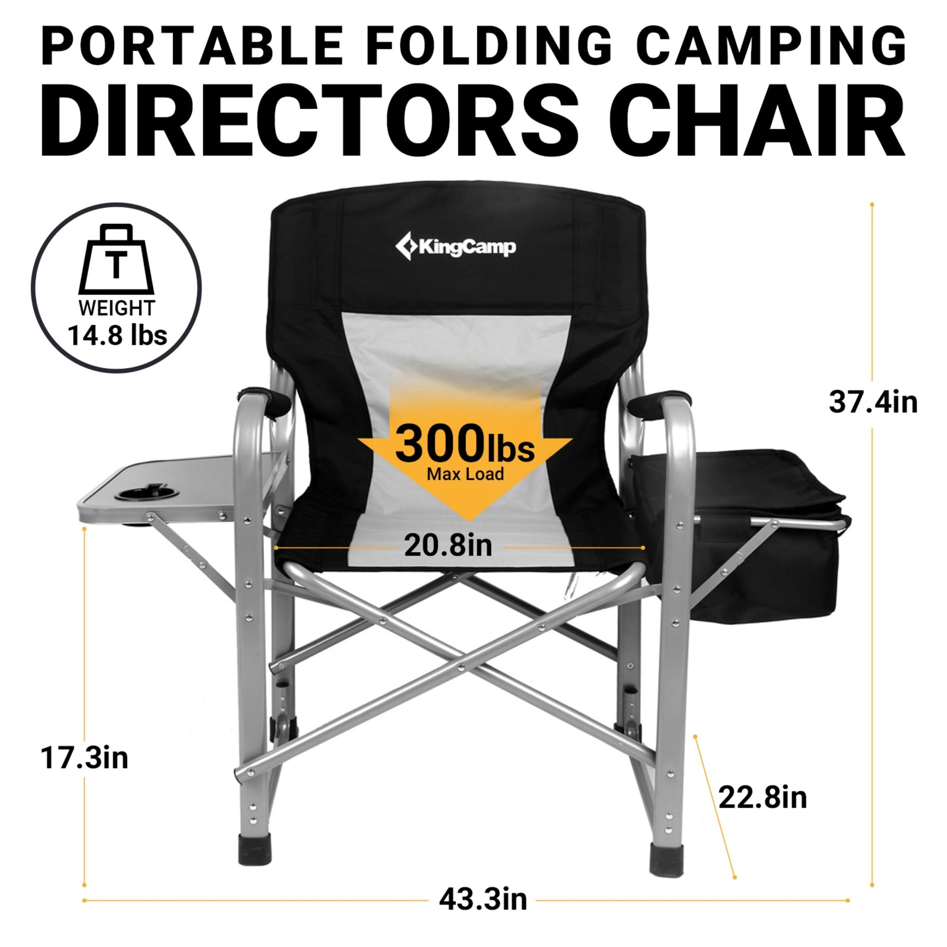 Details: KingCamp Camping Directors Chair Heavy Duty Folding Portable Padded Camping Chair with Side Table Cooler Bag for Outdoor Fishing Tailgating Sports Backpacking Beach Trip Picnic Dimensions: -Set size: 20.8*22.8*37.4 IN -Width: 20.8 IN -Set height: 17.3IN -Packed size: 36.6*22.8*7.1IN -Weight: 14.8LBS -Weight limit: 330LBS -Fabric: 600D Oxford -Frame: Iron flat tubes *More surprising designs √ Padded Armrest √ Cooler Bag √ Cup Holder *These attributes of the camping directors chair can be a good helper for outdoor activities: √ Foldable √ Portable √ Heavy duty √ Compact √ Oversized
