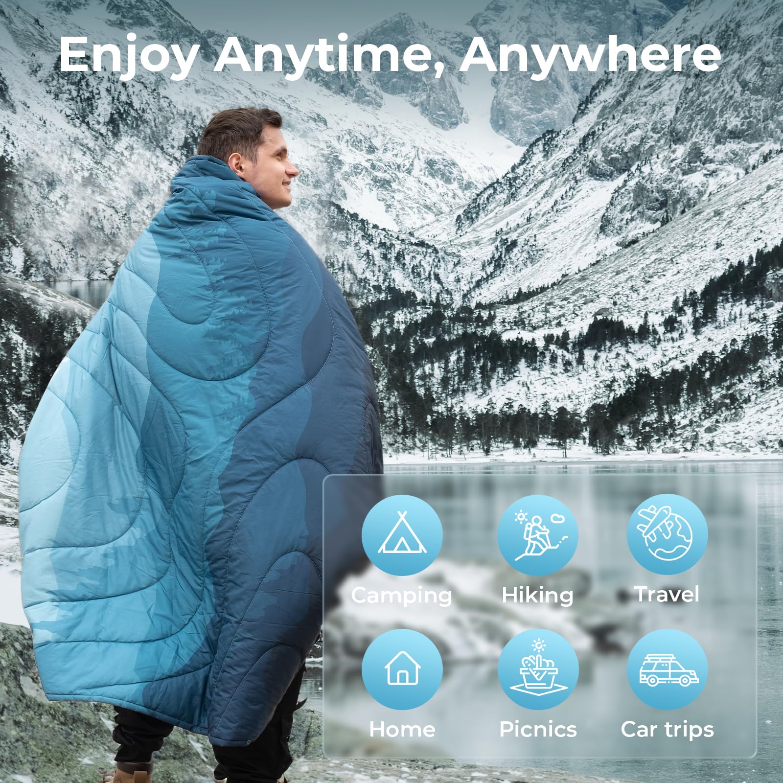 KingCamp Ultralight Camping Blanket, Packable Down Alternative Puffy Printed Wearable Blanket with Snap Buttons & Corner Loops Weatherproof Quilt for Outdoor Travel Stadium (79"L x 57”W, CYAN)