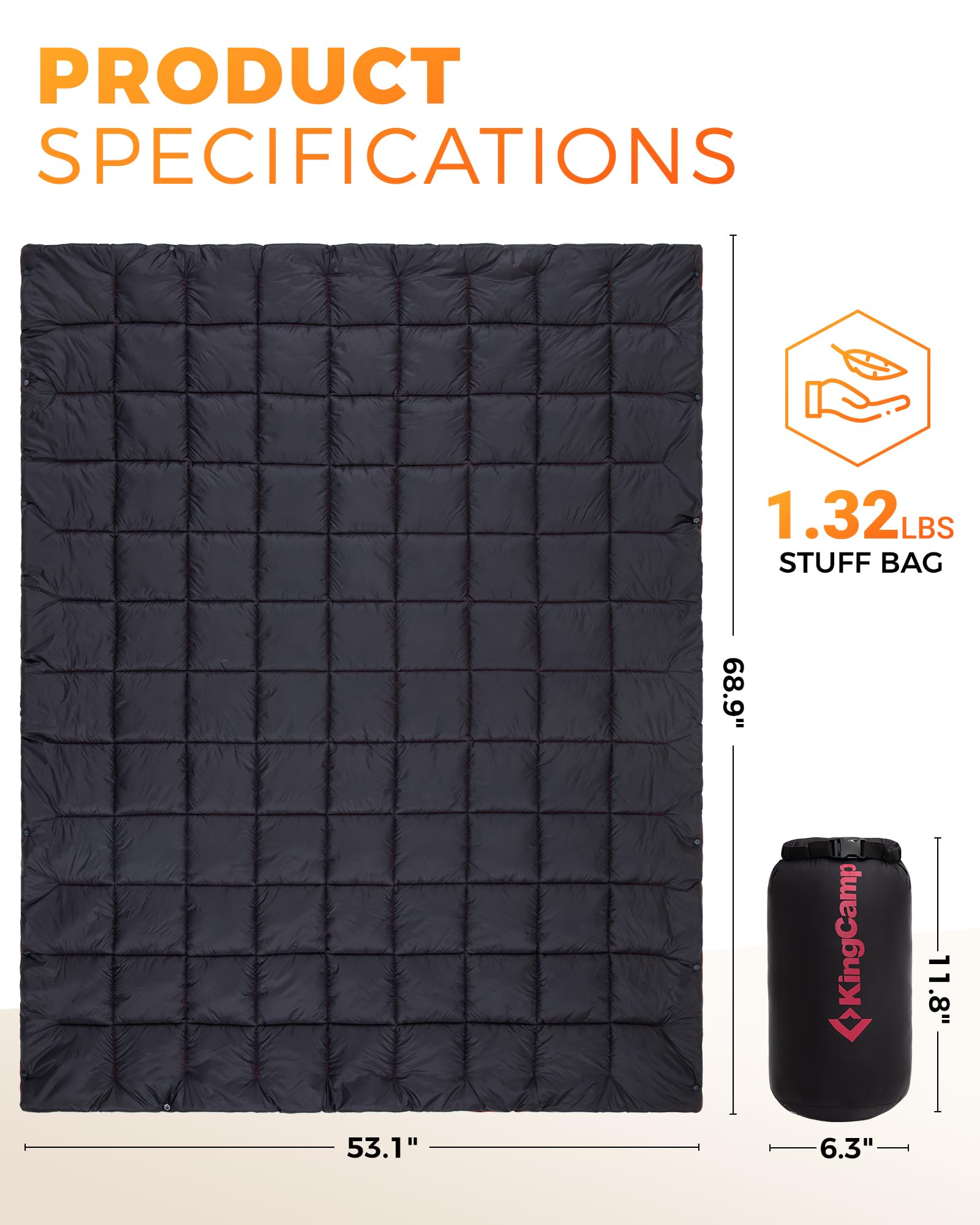 KingCamp Ultralight Camping Blanket, Packable Down Alternative Puffy Wearable Blankets Weatherproof Warm Package Quilt with Snap Buttons for Outdoor Hiking Travel Picnic Stadium (69"L x 53"W, Black)