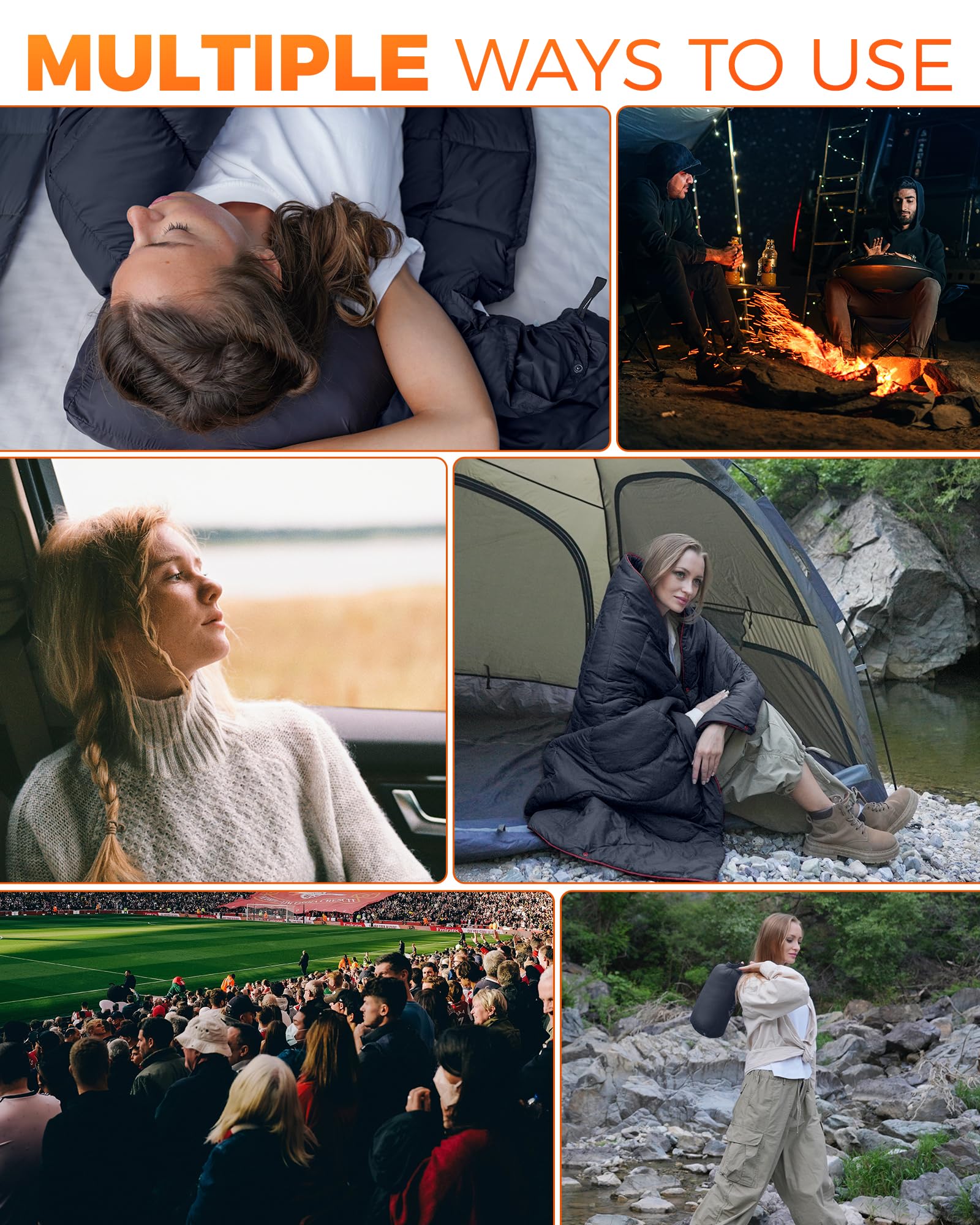 • WEARABLE, HANDS-FREE DESIGN & EXTRA-LARGE COVERAGE FOR TWO: With snap buttons for easy transformation, this puffy camping blanket can be worn like a shawl or cape, keeping your hands free for walking around the campsite, watching outdoor sports, or relaxing by the fire.