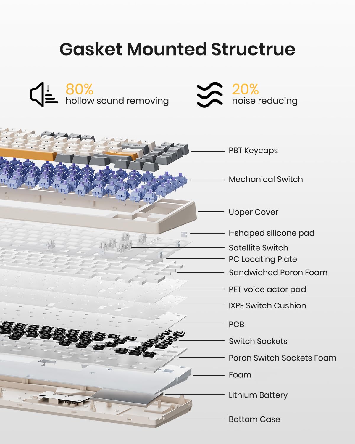 • 【Incredible Typing Experience Starts from Kisnt】Designed with your comfort in mind, this gasket keyboard is absorbing sound effectively. Enhanced with base dampener, along with layers of sound-dampening foam, it delivers a satisfying “thocky” sound, Less hollow sounding, just indulge in pure typing bliss. If you're looking to upgrade from traditional keyboards to a creamy one with every keystroke feel consistent, the KN85 mechanical keyboard is definitel your best budget choice.