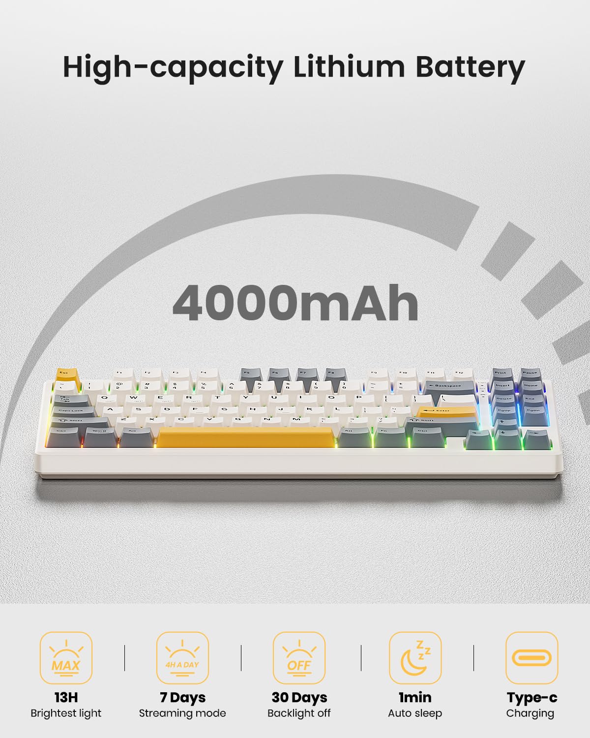 • 【Connect How You Like】Experience unparalleled versatility with our tri-mode connection gaming keyboard: Bluetooth 5.0, 2.4G wireless and wired USB-C. The wired mode is more efficient and stable, plug and play. Cable-free brings you more convenience, it seamlessly switches between different devices and systems with minimal latency, the wireless mechanical keyboard comes with a robust 4000mAh rechargeable battery, with moderate using, it can last up to a week, making it ideal for extended work or gaming sessions without frequent charging.