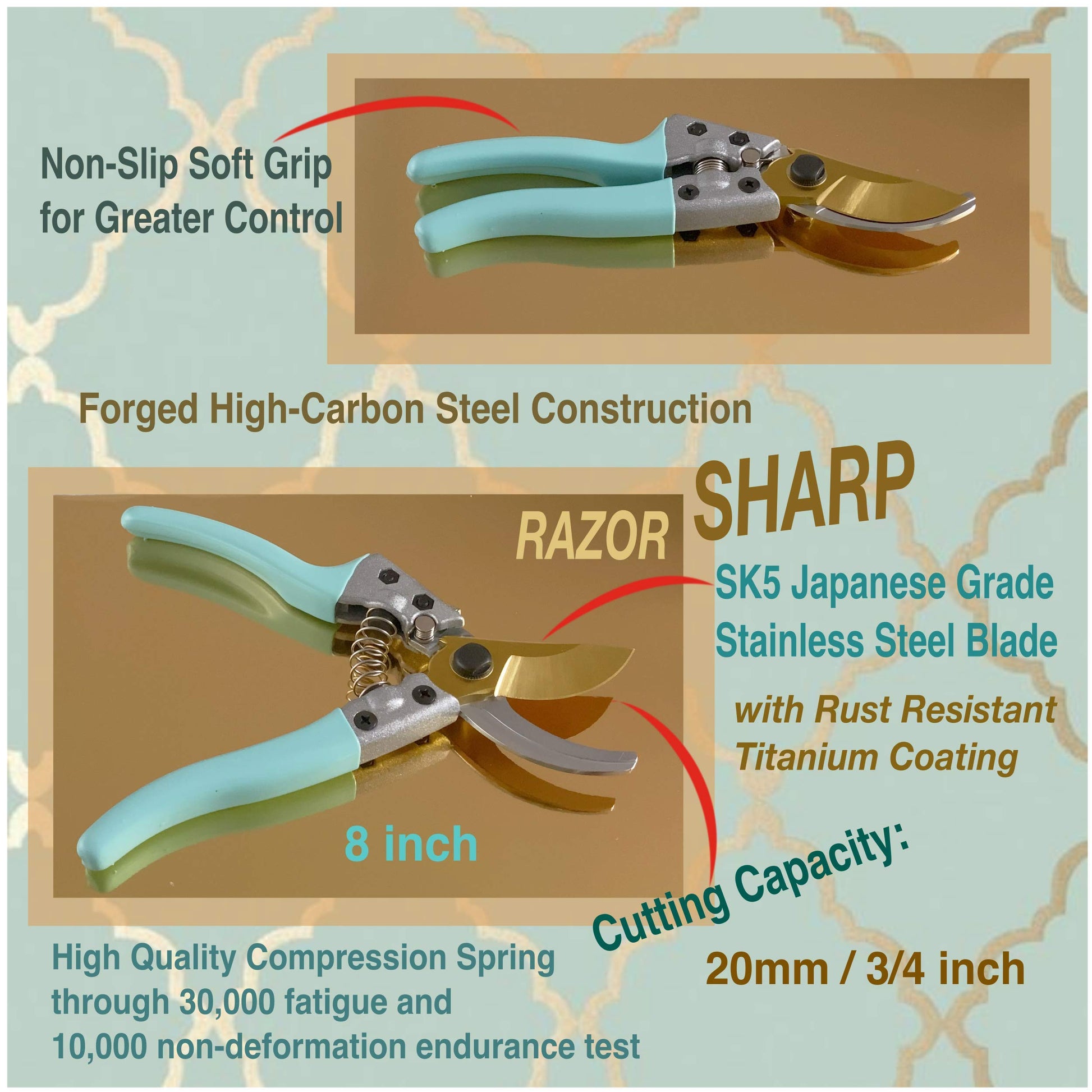 • ✅RUST RESISTANT DESIGN - We've engineered hand tools from rust resistant aluminum while the pruning shears are made of Japanese SK-5 Carbon steel with Ultra-fine Polishing Technology, and is Titanium coated for corrosion resistance and toughness. Lightweight & ergonomic with comfortable rubber handle.