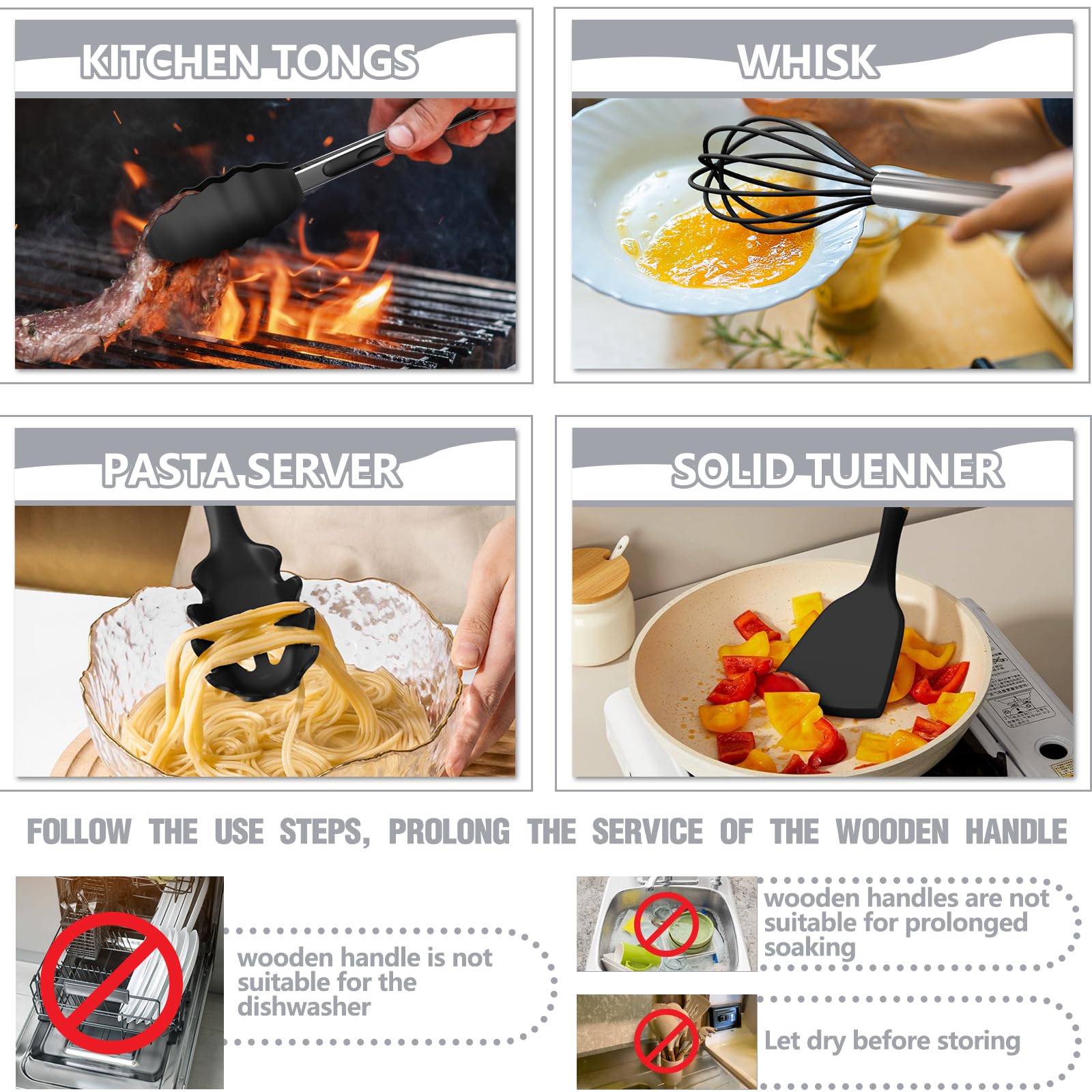 • VINTAGE WOODEN HANDLE -EASY TO CLEAN Each wooden handle is made of solid wood which is anti scalding. Smooth and comfortable to the touch, it completely prevents the heat transfer during the cooking process. Please note that each wooden handle has a slightly different color and texture. The one-piece design eliminates any gaps where food can get trapped, making cleaning a breeze. PLEASE NOTE that due to the wooden handle, We don't recommend soaking in water for a long time or dishwasher cleaning