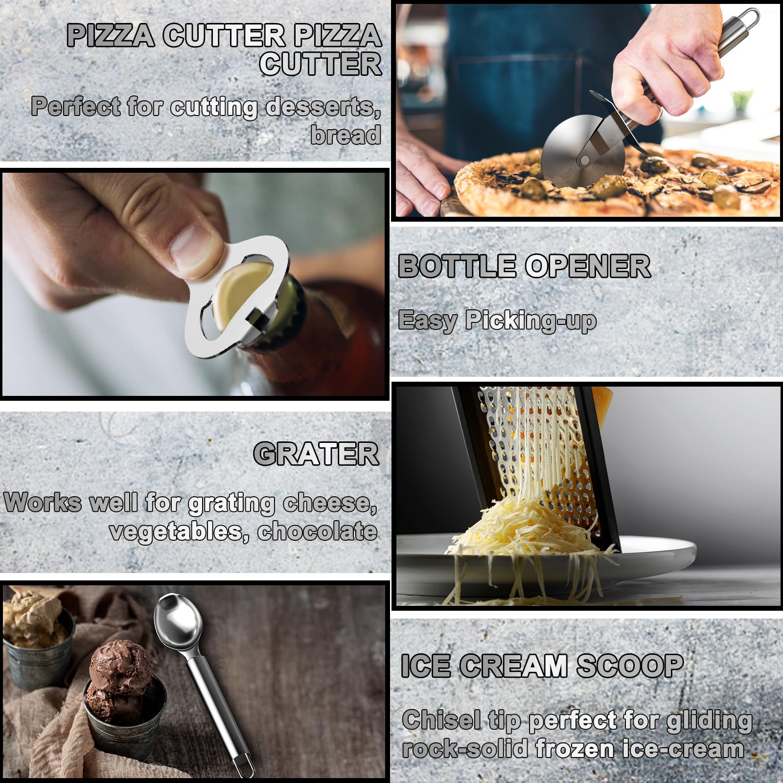 • EVERYTHING YOU NEED From the everyday kitchen spoons to the garlic crusher, we included all the kitchen stuff you could possibly need to bring out your inner chef. This means you don’t have to spend extra money on repetitive utensil tools. This cooking utensils set includes Slotted Spatula, Slotted Spoon, Turner, Pasta Server, Solid Spoon, Kitchen Tongs and other kitchen tools such as Pizza Cutter, Grater, Can opener, Scissors and so on. Almost everything you need in a kitchen is in one box.