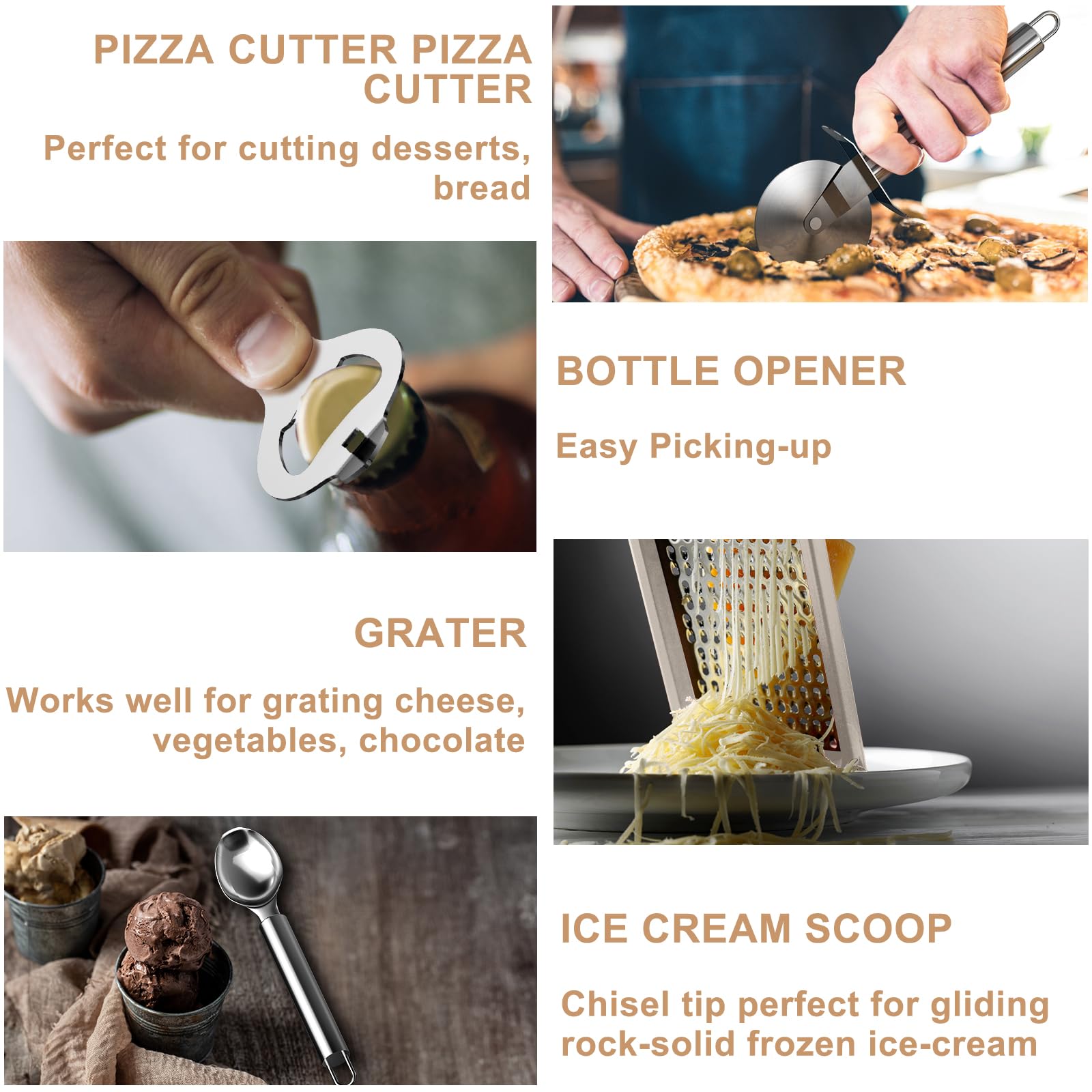 • EVERYTHING YOU NEED From the everyday kitchen spoons to the garlic crusher, we included all the kitchen stuff you could possibly need to bring out your inner chef. This means you don’t have to spend extra money on repetitive utensil tools. This cooking utensils set includes Slotted Spatula, Slotted Spoon, Turner, Pasta Server, Solid Spoon, Kitchen Tongs and other kitchen tools such as Pizza Cutter, Grater, Can opener, Scissors and so on. Almost everything you need in a kitchen is in one box.