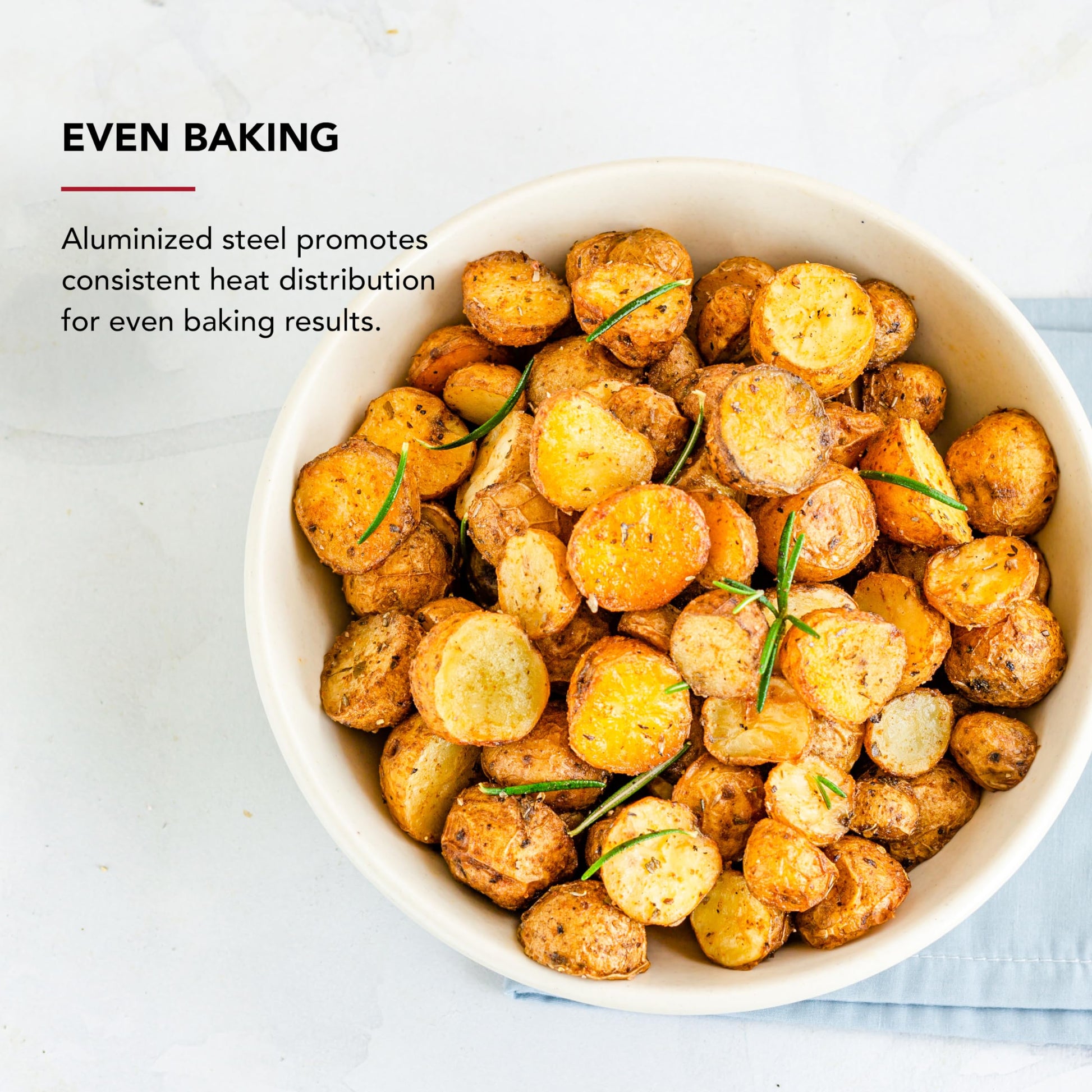 • GREAT RESULTS: aluminized steel construction promotes consistent heat distribution across the pan, allowing for evenly baked desserts and perfectly roasted dishes