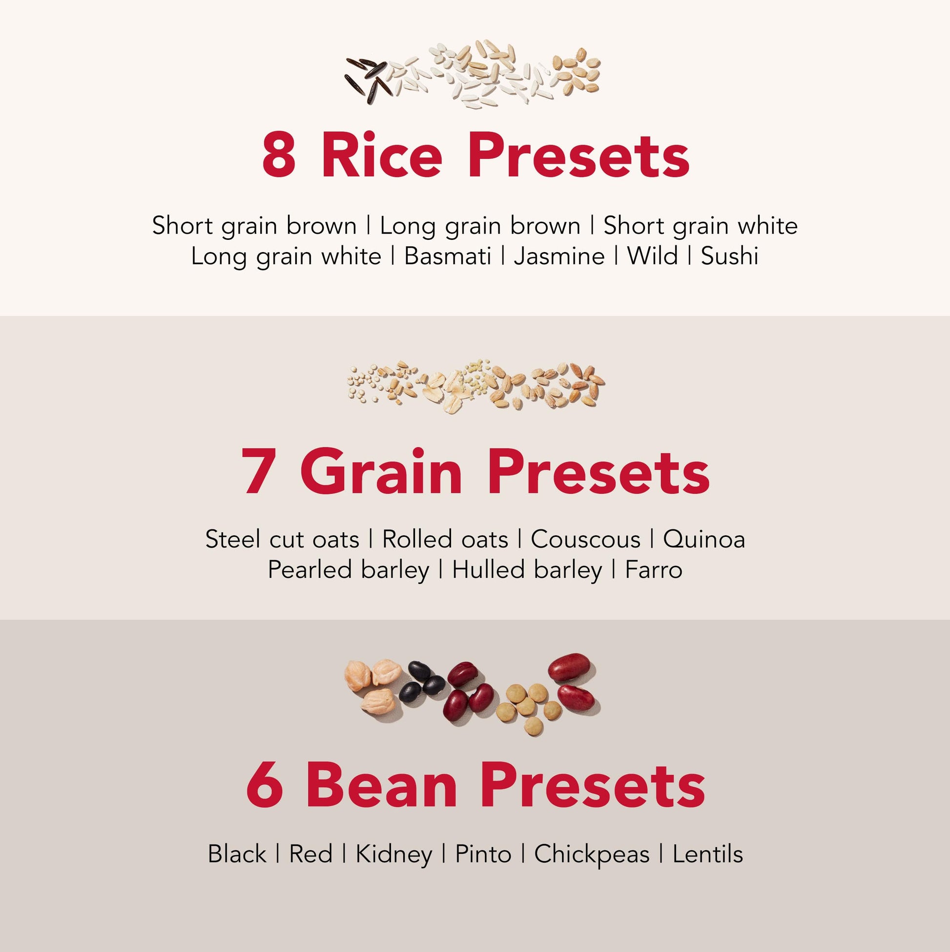 • Explore a whole new world of whole grains with 21 preset options for rice, beans, oats, couscous, quinoa, barley, farro and more