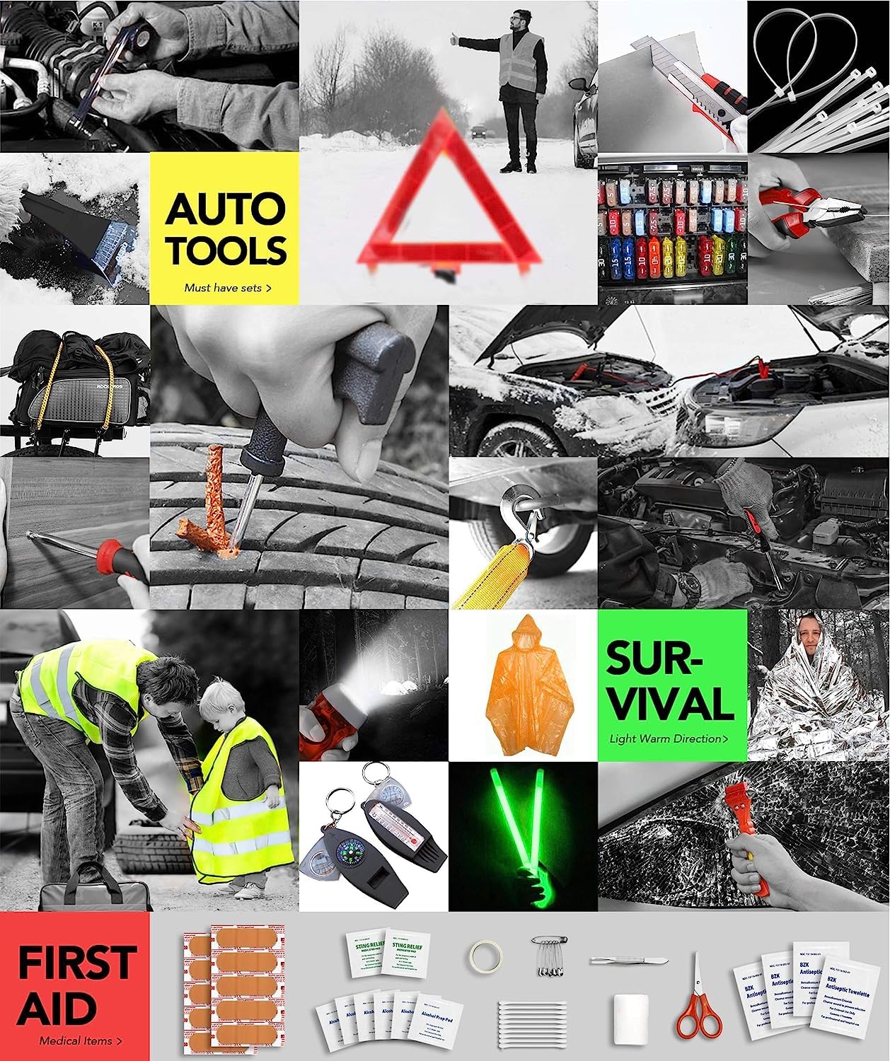 • ALL-IN-ONE: This automotive safety kit contains all basic essential high-quality accessories for most unexpected auto emergencies, includes 34 car tools & 38 medical supplies, such as 8GA Jumper Cables, Warning Triangle, Hand-Crank Flashlight, Tow Rope, Snow Shovel, Screwdriver Set, Life Hammer, Tire Pressure Gauge, 2 in 1 Compass Whistle, Reflective Vest, Long Nose Pliers, etc.