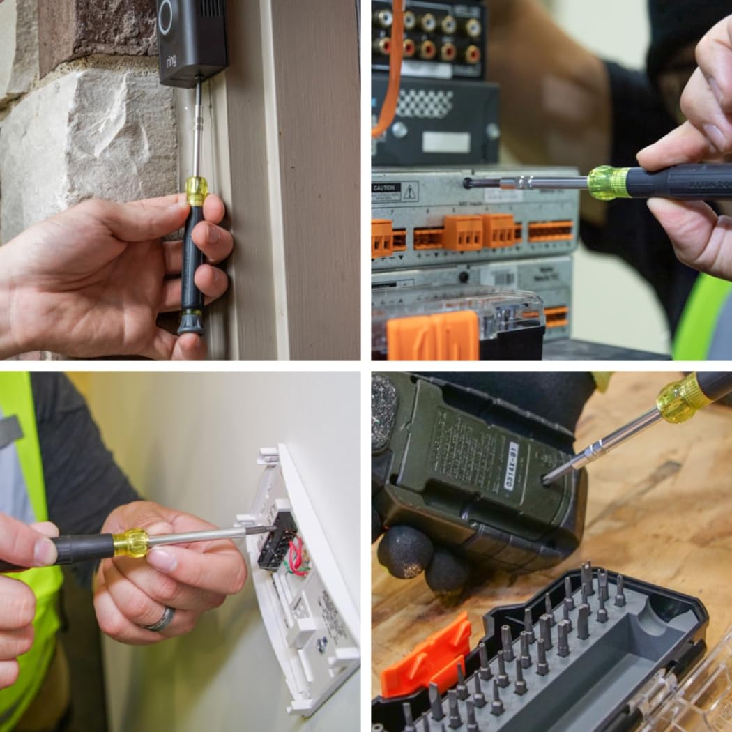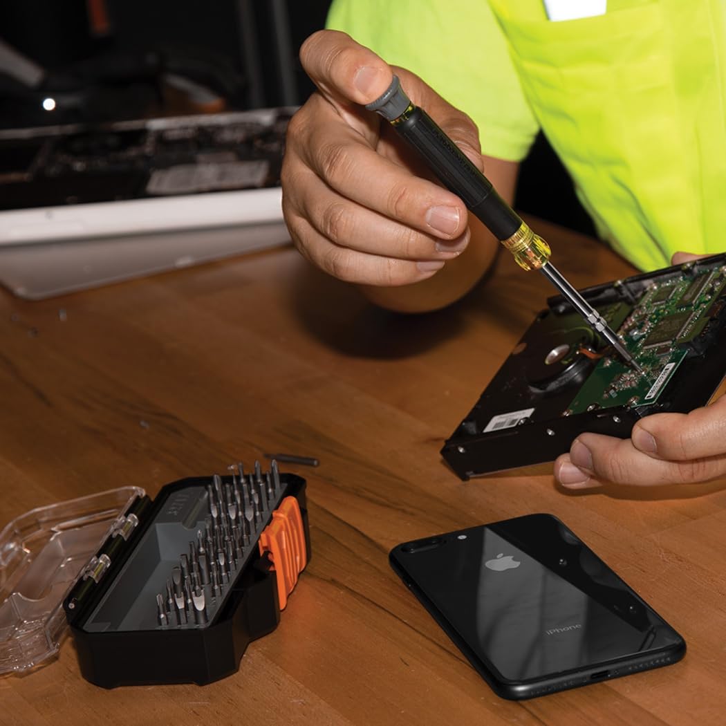 Details: Klein Tools' All-in-1 Precision Screwdriver Set with compact carrying case features 39 precision bits. This set provides everything you need to work with electronics and precision fasteners including those for Apple products such as Apple iPhone, MacBook, and Watch. The reversible barrel is standard on one side and extra-long on the other for those hard-to-reach jobs. Powerful magnets housed in the barrel better secure the bit, which also allows it to easily pick-up and retain fasteners. The Cushion-Grip handle and spin cap provide outstanding comfort and control.