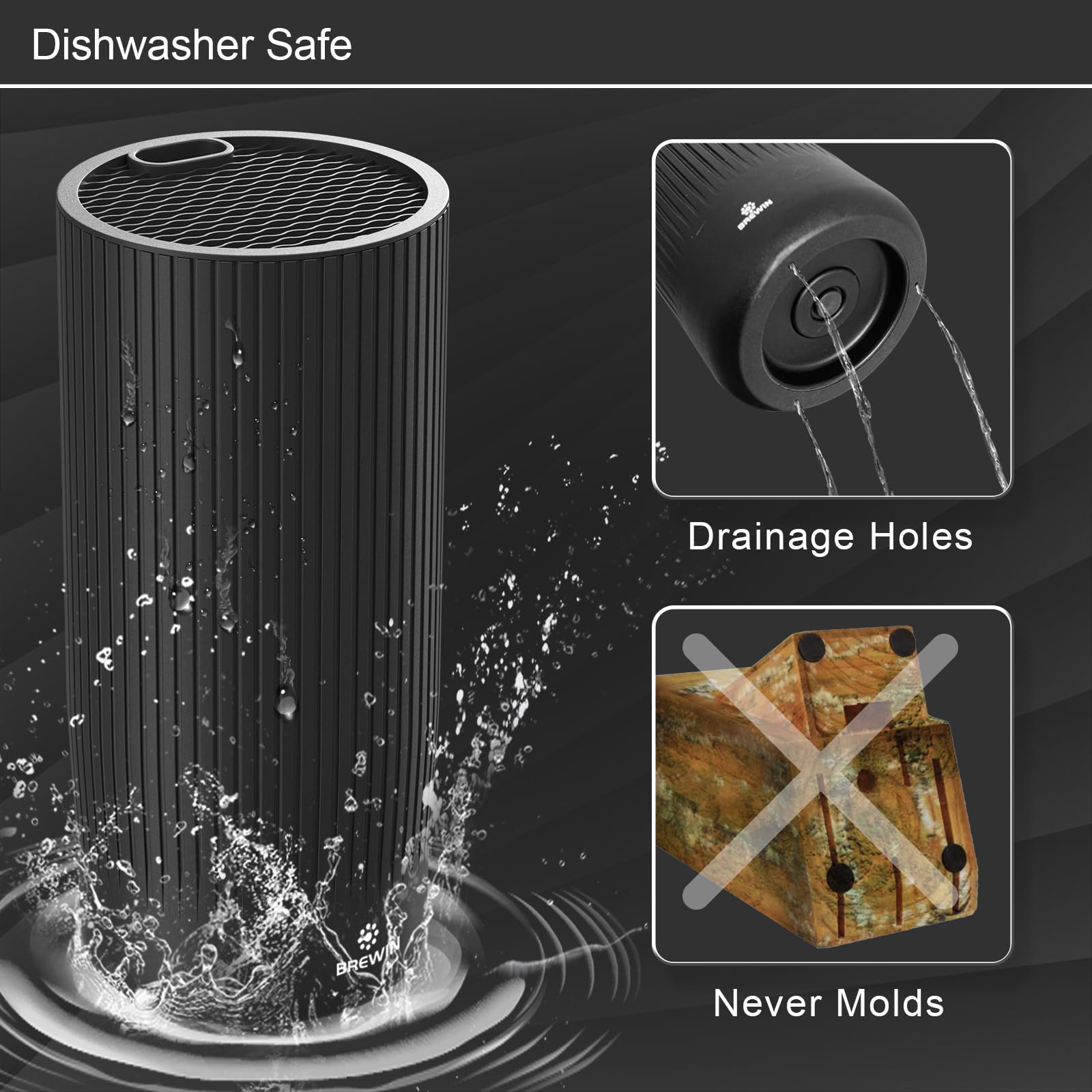 • DISHWASHER SAFE - Our aesthetic knife block is made of high density polypropylene, with drainage holes at the bottom. Both knives and block are dishwasher safe.