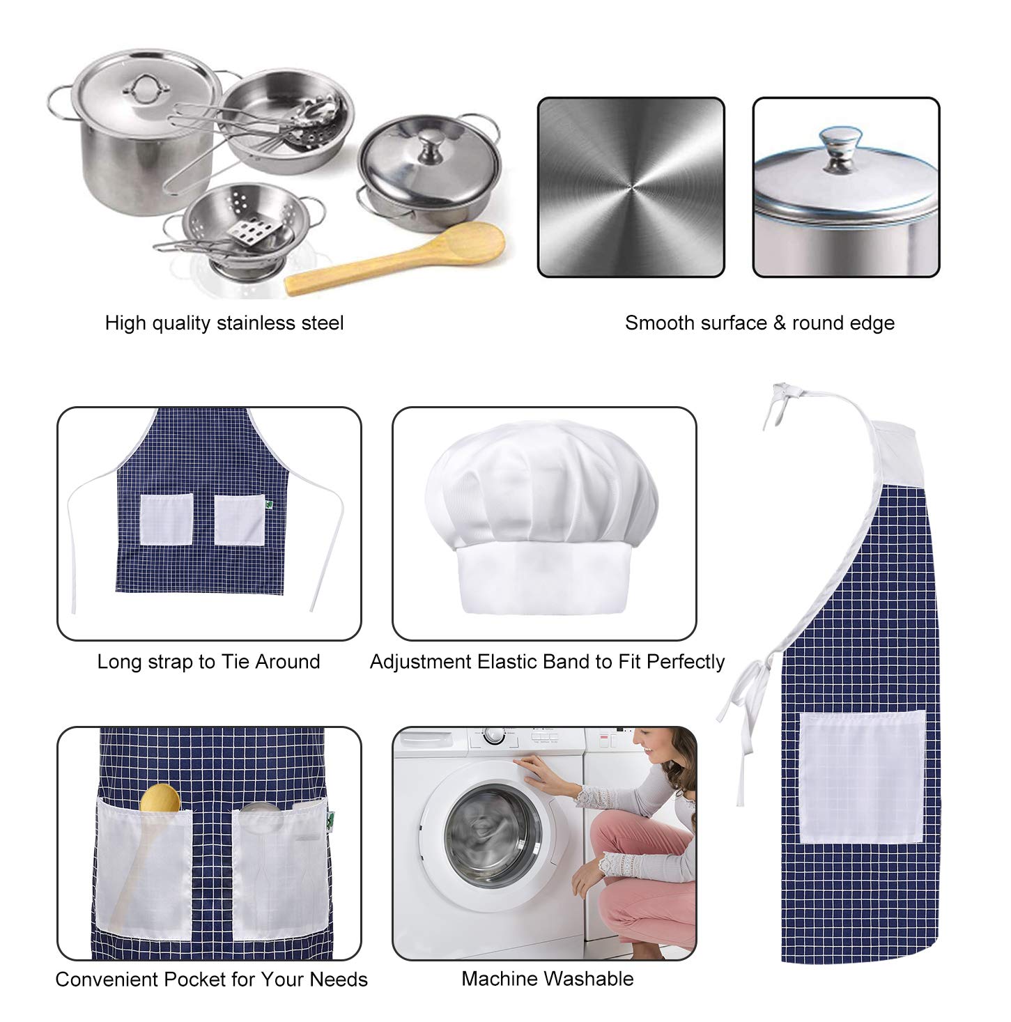 • 🥦【PLAY KITCHEN ACCESSORIES 】: Includes a Total of 24 Pieces: a Colander, Stainless Steel Play Pots and Pans with Lid and Handles, 4 Stainless Steel and Wooden Utensils, Apron & Chef Hat, Pot Holder, and Cutting Vegetable Toys.