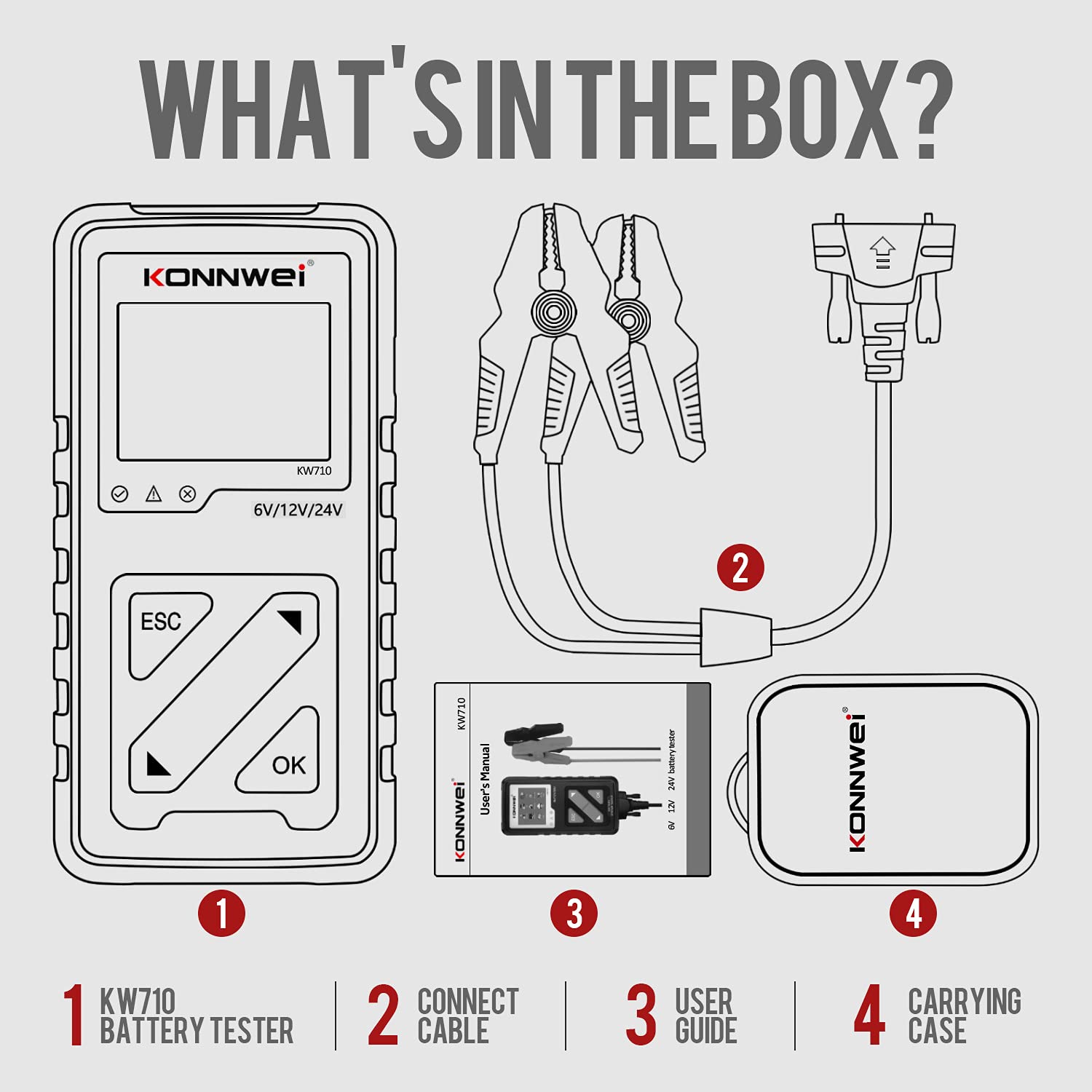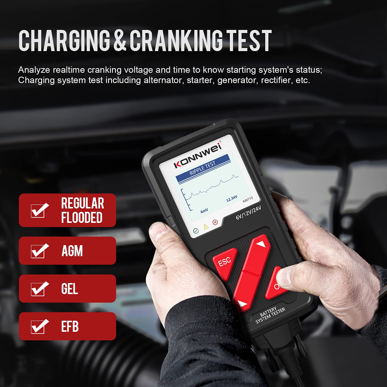 • 【6V-12V-24V CAR BATTERY TESTER】 KW710 is the top 1 battery tester automotive which can works on all 6V, 12V and 24V batteries(100-2000 CCA), testing result up to 99.99% accuracy, also great alternator and starter tester, the most reliable battery load tester on the market. Perfect household tool and present for daily use! NEW REPLACEMENT AVAILABLE FOR ANY QUALITY ISSUE.