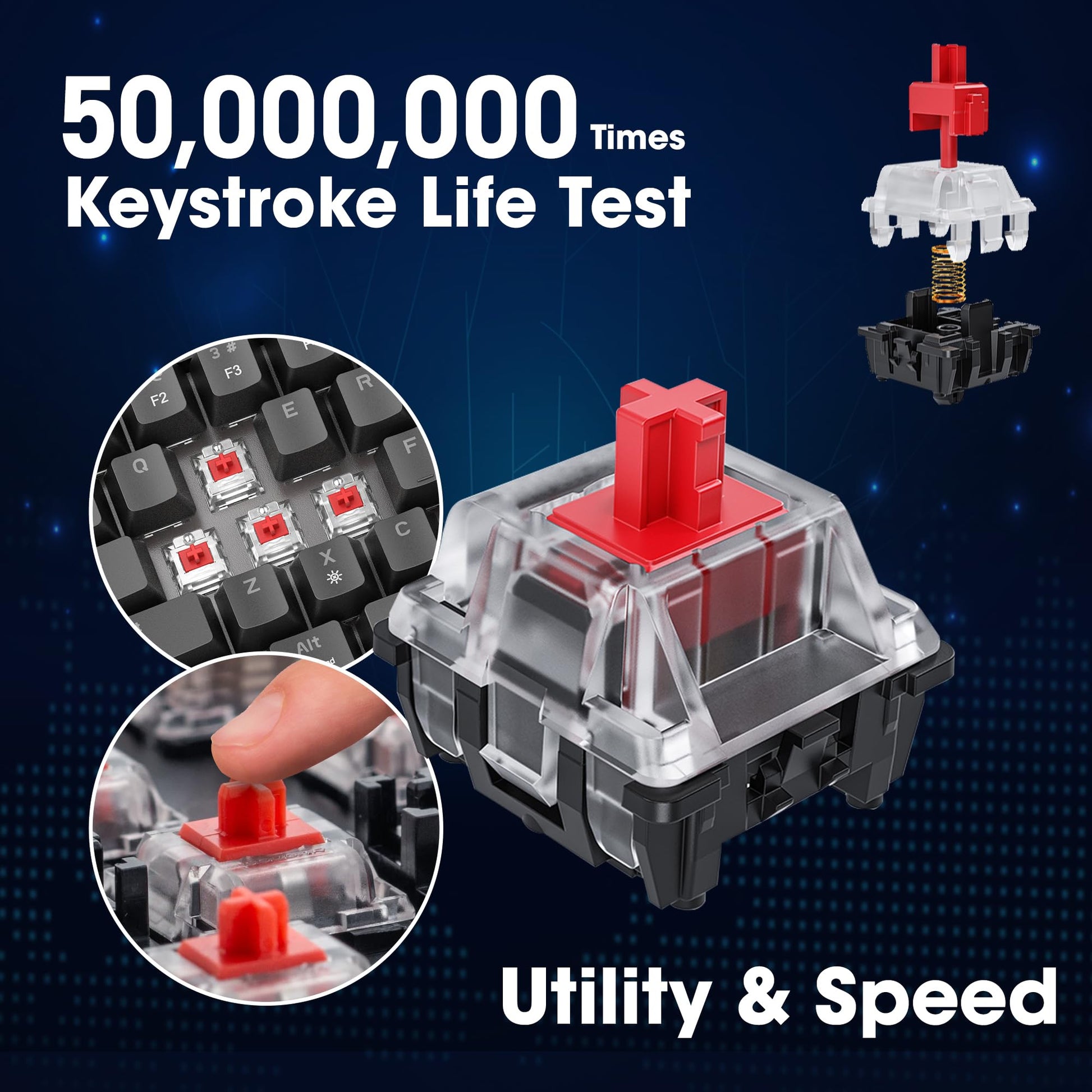 • Red Switch or Blue Switch: Quiet red switch: Provides linear keystrokes without tactile collisions or clicks. This silent gaming keyboard produces minimal noise and allows for quick and easy typing. Clicky blue switch: When pressed, a noticeable tactile collision can be felt. The combination of tactile feedback and sound clicks is very suitable for gamers. You can choose what you like.