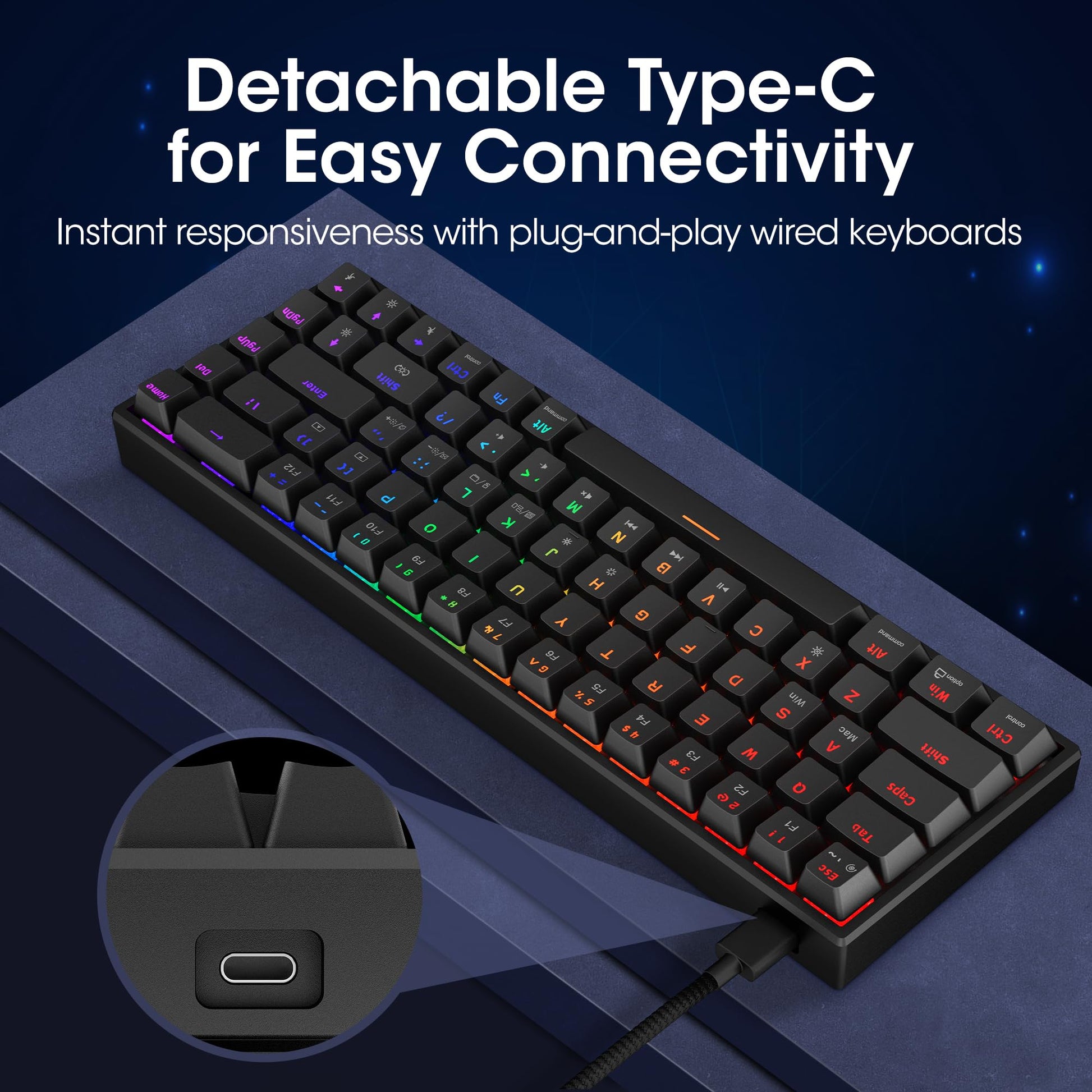 • 68 Keys with Gorgeous Backlighting: The gaming keyboard 60 percent can save desk space.The detachable Type-C cable and small size make it easy to carry around for home/office use or business trips.It offers 19 different cool backlighting modes for choice.Additionally,the lighting has a memory function,you can quickly resume your preferred lighting mode when restart computer.