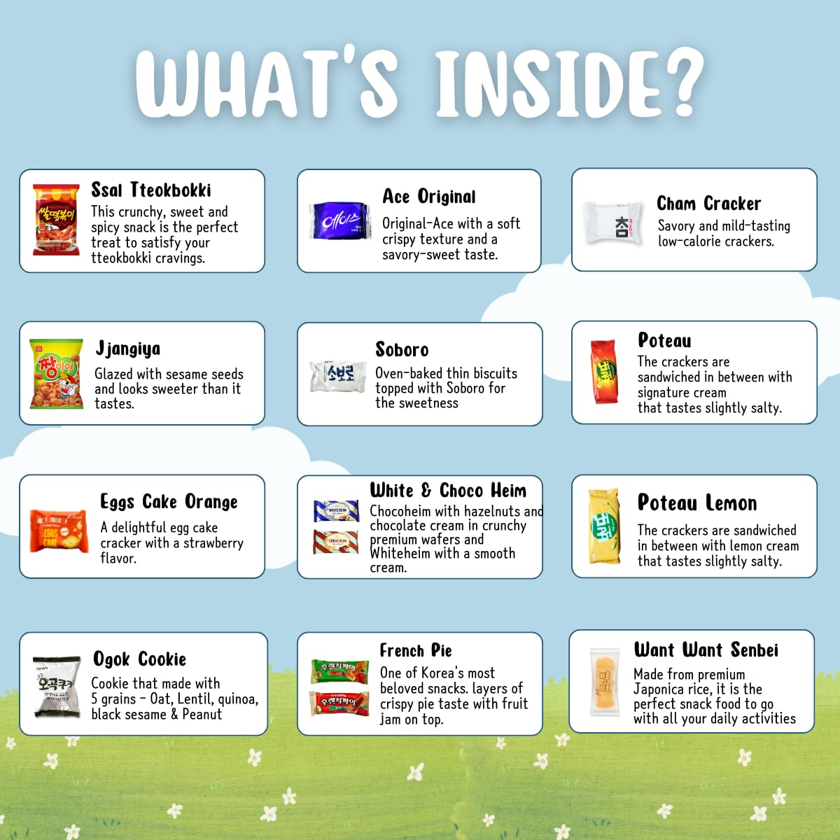 • 50-count Korean snack assortment - Includes a mix of individually wrapped sweet and savory treats. Features candy, cookies, crackers, chips, and more for a diverse snacking experience.