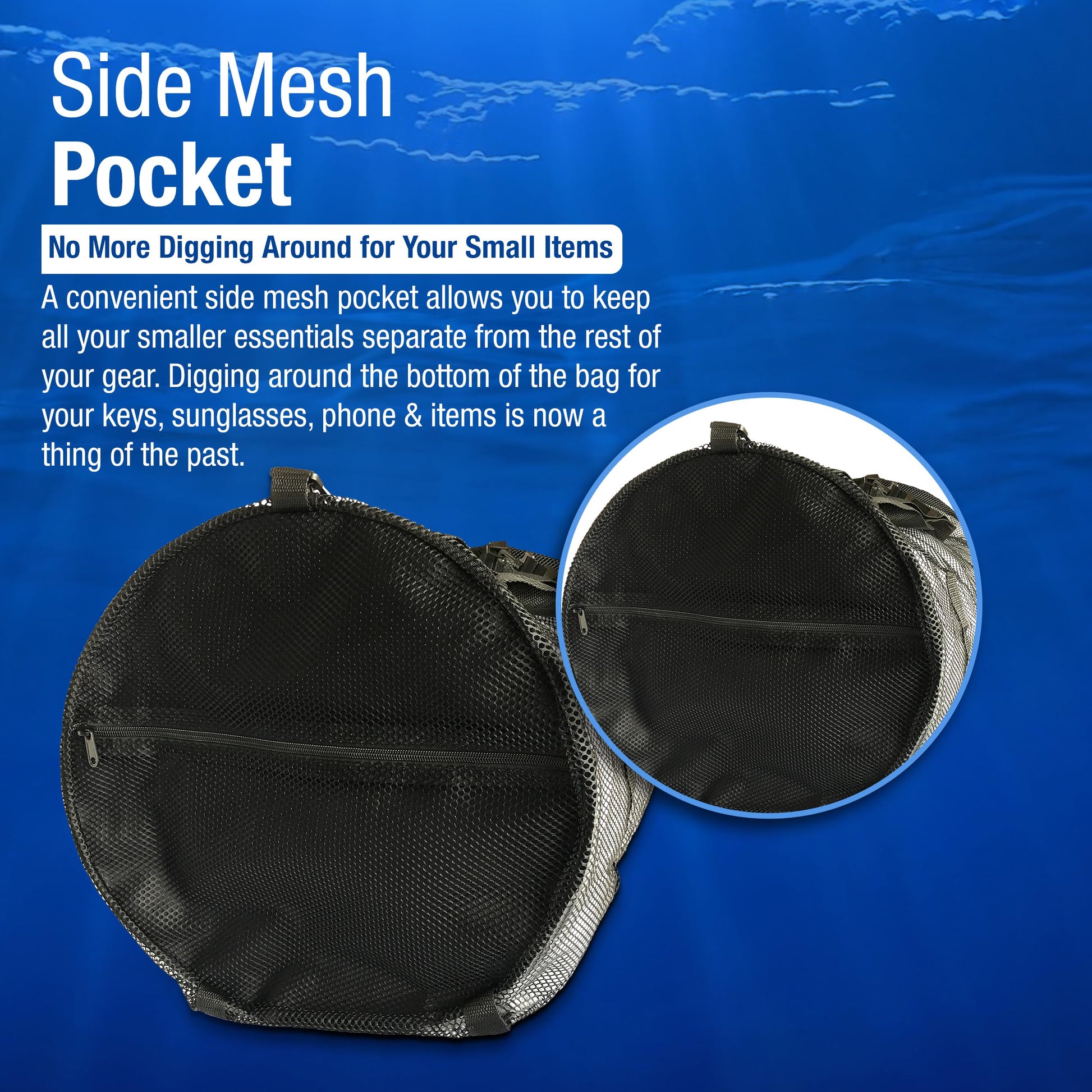 • Multiple Storage Options for Small Essentials: A zippered side mesh pocket securely holds small items like keys, sunscreen, sunglasses, gloves, and dive accessories, keeping them easily accessible. The built-in storage pocket allows the scuba diving gear bag to fold into itself for compact storage, making it easy to pack for travel. Ideal for use as a swim bag, gym bag, or beach duffle, it's versatile enough for various activities beyond diving.