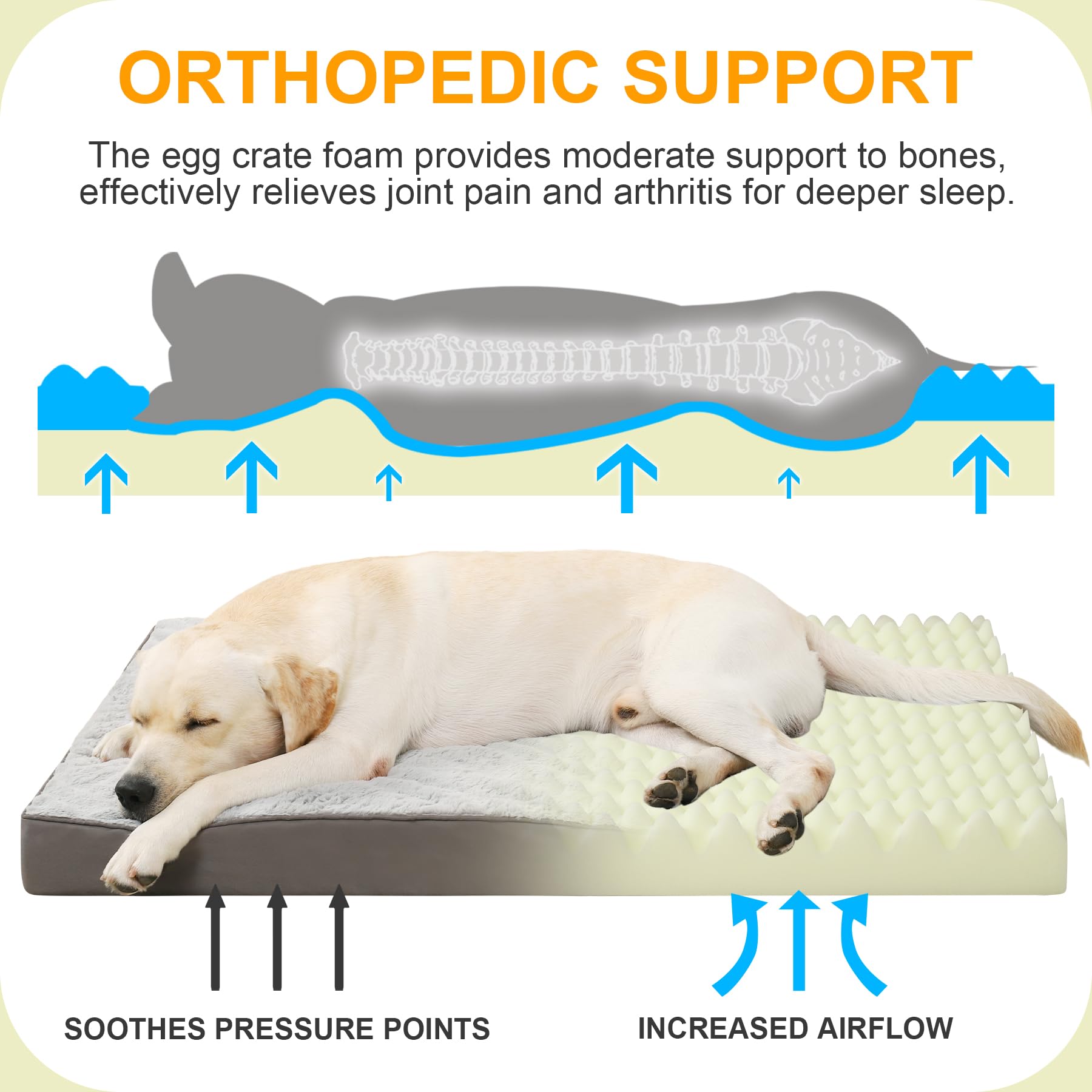 • Orthopedic Support - Our dog crate bed equips a 3-inch thick high-density egg crate foam, which helps evenly distribute our dog's weight, comfort our dogs with strong support to bones and joint, effectively relieves joint pain and arthritis, encourages deep and restful sleep, especially for puppies and older dogs.