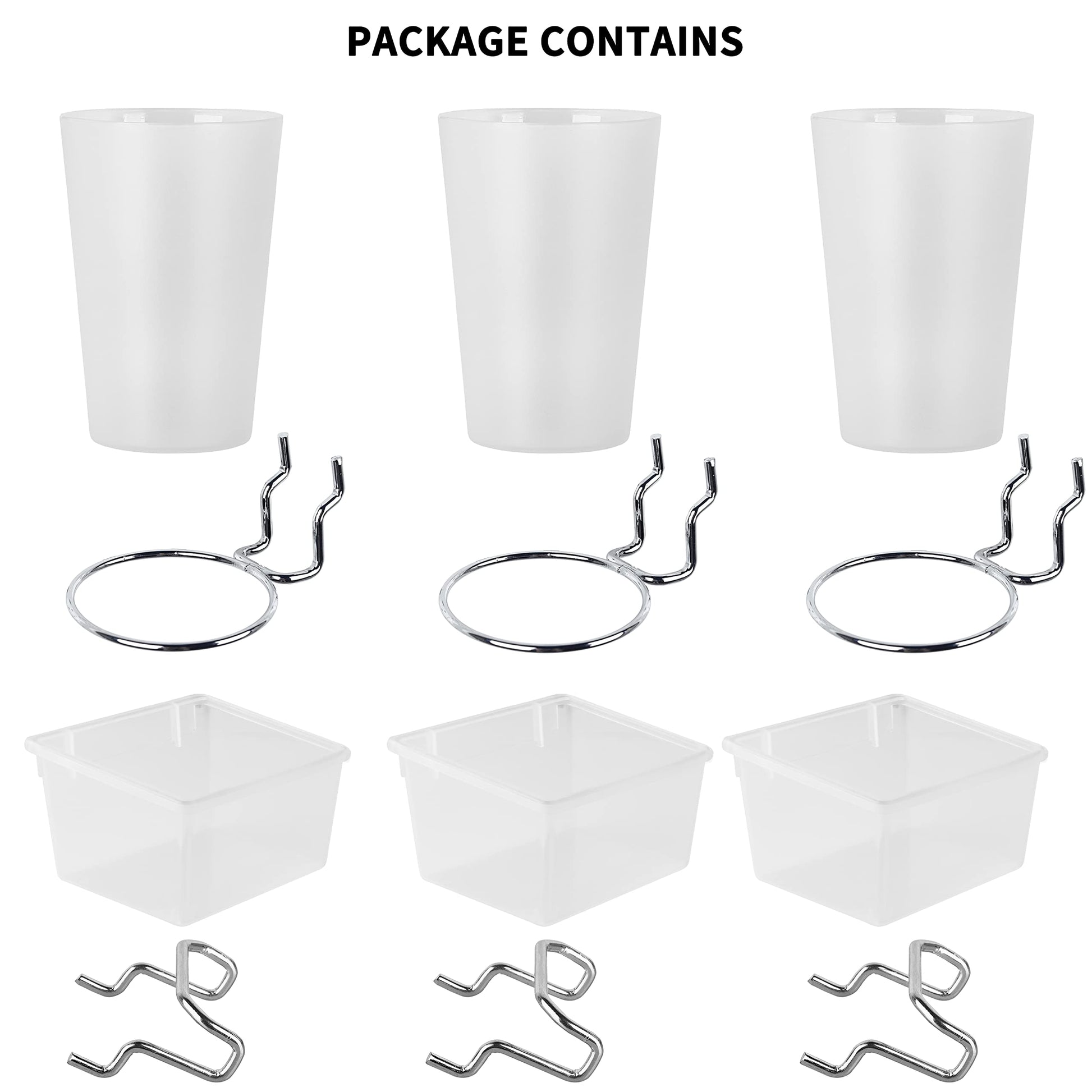 Package Including: 3 pegboard cups with their matching 3 pegboard rings, 3 pegboard bins with their matching 3 pegboard hooks. Attention! Package Not Including Pegboard!