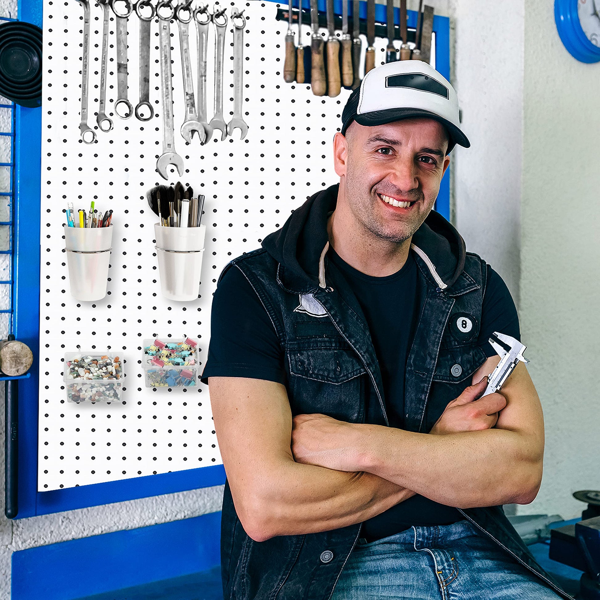 Wide Application: Pegboard cups and pegboard bins with hooks are perfect for storing pens, markers, scissors, rulers, brushes, combs, pliers, drills, wrenches, screwdrivers, screws, nuts, bolts, paper clips, buttons, and other arts and crafts accessories. Ideal for organizing your craft room, workbench, basement, garage, shop or office—Perfect Storage Solutions For Business Owners.